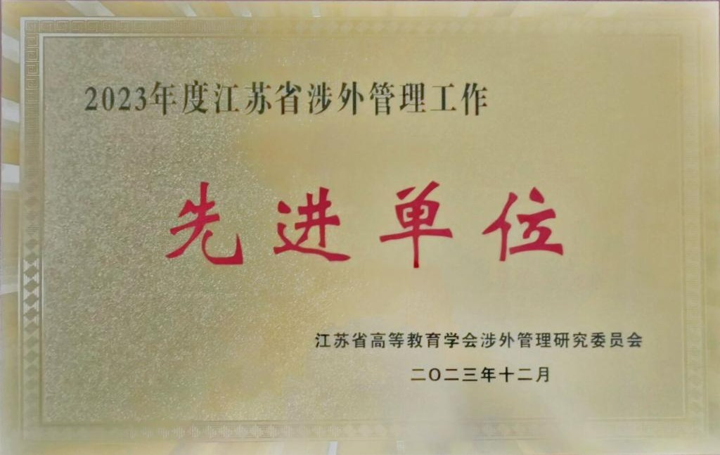 据悉,此荣誉是江苏省高等教育学会授予在涉外管理工作中具有标杆性示范作用的高校,2023年度全省共有28所本科院校获得“先进单位”荣誉称号。