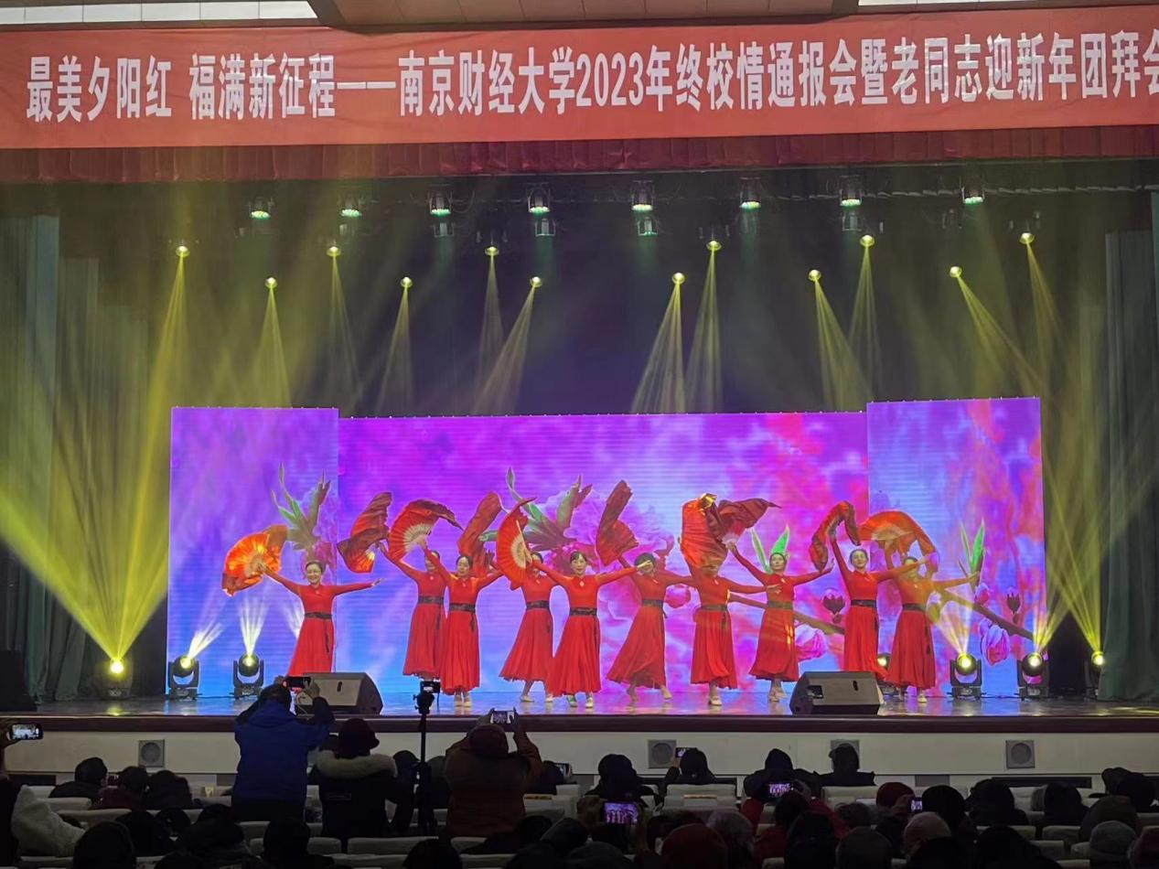 树高千尺不忘根,水流万里总思源。校情通报会后,我校夕阳红艺术团带来精彩的“最美夕阳红▪福满新征程”文艺演出。在岁序更迭、辞旧迎新的喜庆时刻,一年一度的团拜会活动及时把学校党委行政的关怀和温暖送到离退休老同志的心坎上,让离退休老同志有了更多交流和展示的舞台,营造了“南财一家亲”的良好氛围,增强了离退休老同志的幸福感和归属感。团拜会在激昂欢快的歌伴舞《我和我的祖国》中圆满结束。