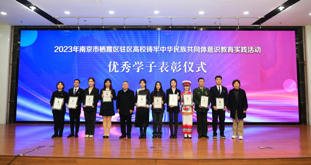 本次活动,驻区11所高校遴选出了一批在专业学习、实践创新、励志进取方面表现突出,为铸牢中华民族共同体意识作出积极贡献的优秀学生。我校营销与物流管理学院古丽孜巴·吐尔孙江、艺术设计学院谢怡等55名驻区高校学生被评为“2023年度南京市栖霞驻区高校‘铸牢中华民族共同体意识’教育实践活动优秀学子”。现场,由栖霞区11家商会与11所高校组建的“栖霞区铸牢中华民族共同体意识校企联盟”为优秀学子发放爱心奖学金。