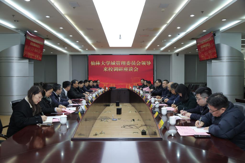 1月18日上午,仙林大学城管委会党工委副书记、管委会副主任王辉,党工委委员、管委会副主任金波、熊俊、张弨,党工委委员、一级调研员姚学敏率大学城管委会办公室、招商局、科教创新处、组织人事处等相关部门负责同志来我校调研,围绕“更好服务属地高校,促进校地融合发展”主题进行座谈。校党委副书记李群,党委常委、副校长李煜,副校长张炳,党政办、党委宣传部、保卫处、科研处、后勤基建处、对外联络处、成果转化与社会服务中心等相关部门负责同志参加调研座谈会。座谈会在仙林校区行政楼十六楼会议室举行。