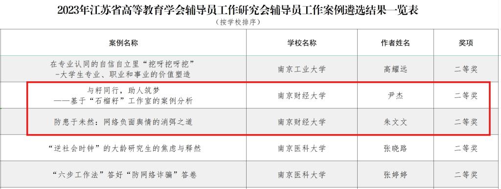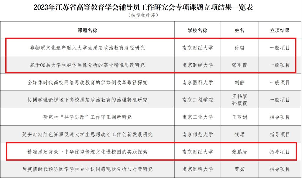 近日,江苏省高等教育学会辅导员工作研究委员会公布了工作案例遴选与专项课题立项结果。我校根据相关通知要求限额申报了3项课题和2个工作案例,全部立项及获奖。