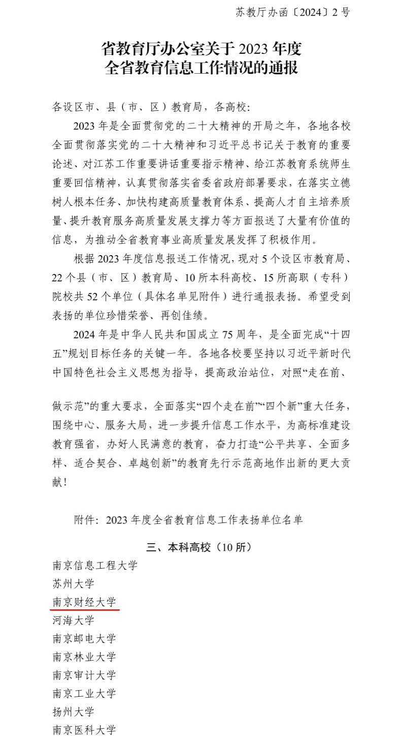 日前,江苏省教育厅办公室公布《关于2023年度全省教育信息工作情况的通报》(苏教厅办函〔2024〕2号),我校再次获评全省教育信息工作表扬单位,总积分在全省本科高校中排名第3,其中江苏教育网积分在全省本科高校中排名第1,这是我校自2016年以来连续八年获此荣誉。