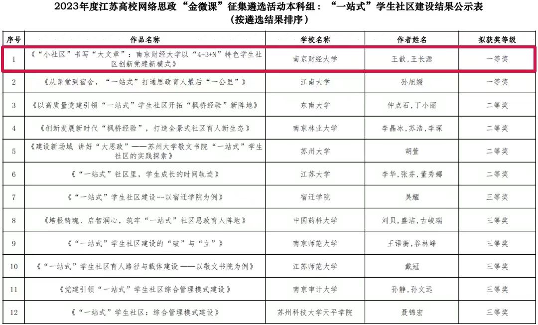近日,2023年度江苏省高校网络思政“金微课”征集评选活动获奖名单公布,我校报送的作品《“小社区”书写“大文章”:南京财经大学以“4+3+N”特色学生社区创新党建新模式》(作者:王歆、王长源)喜获本科组一等奖第一名。