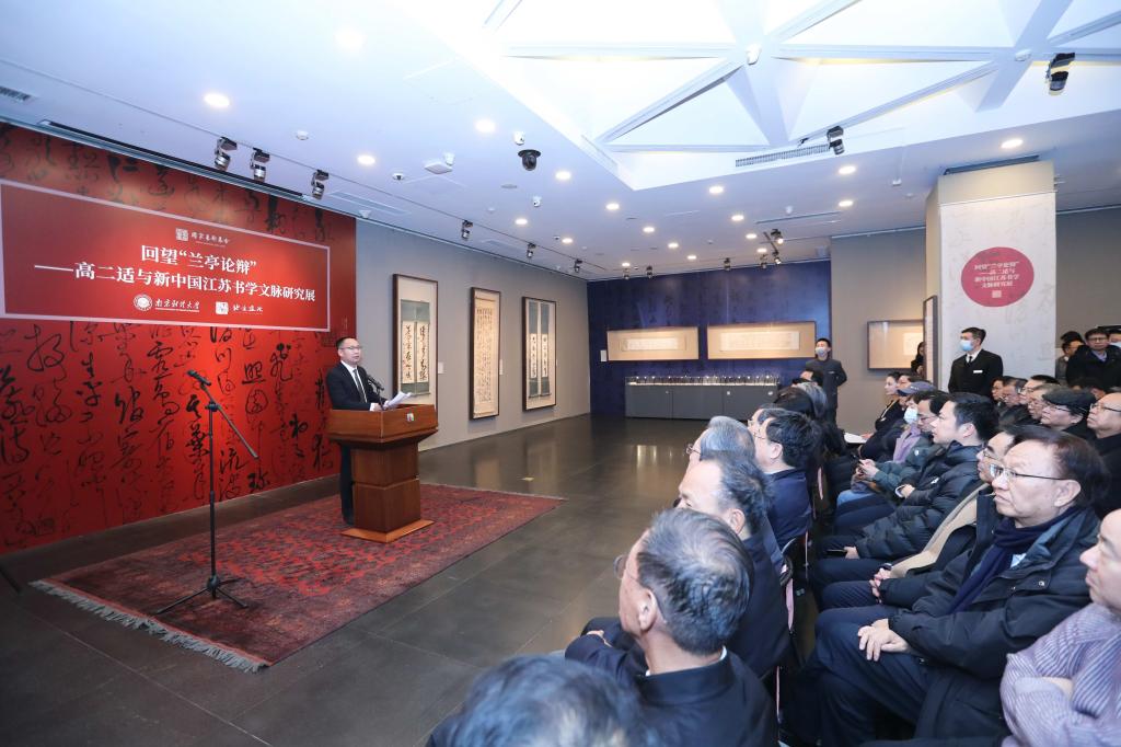 当日下午,北京画院院长吴洪亮先生主持本次展览开幕式。我校党委常委、副校长叶林祥代表主办单位致辞。他向各位领导、嘉宾的到来表示诚挚欢迎,向展览的圆满举办表示热烈祝贺。他表示,北京画院作为新中国最早的专业画院,大师辈出。本次展览将高二适先生的书法与齐白石先生、黄宾虹先生的绘画共同呈现在这样的艺术殿堂,不仅是中国传统书画文化的交流,也是对江苏省特色文化的弘扬与展现。本次展览旨在弘扬“兰亭论辩”的学术风尚和艺术精神,展示高二适先生的文士风骨和高贵品格,展现高二适先生博大精深的书法艺术造诣,探究他在江苏当代书学发展中的作用与地位。南京财经大学作为江苏高水平大学建设高校,一直将文化传承作为长期坚守的初心使命。学校大力实施“文体增色”特色工程,深入开展艺术教育,积极推进校园文化建设。近年来,学校在传统文化建设和各项艺术实践活动中都取得了丰硕成果,主办本次展览是我校在弘扬中国传统文化、传播中国价值道路上的一次新的实践。