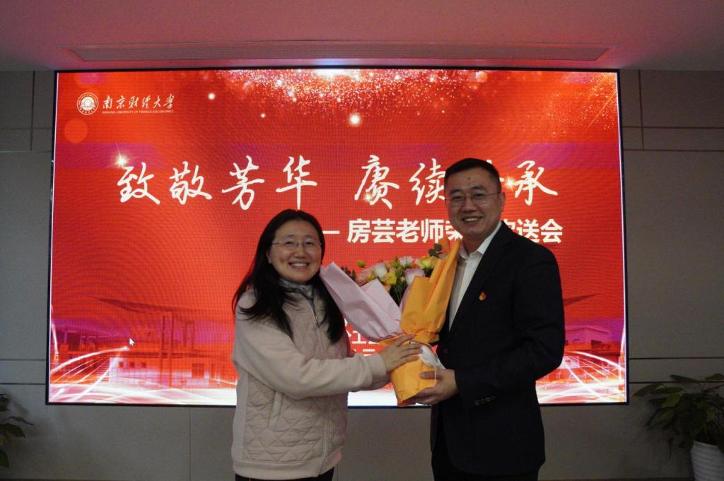 赵国栋副校长作总结讲话,为房芸老师送上鲜花和纪念品,并合影留念。赵国栋副校长说,荣休教职工是学校发展的亲历者、建设者和贡献者,代表一股永不褪色的精神力量。他感谢房芸老师和大家一起多年的倾情奉献、拼搏进取、勤勉耕耘;诚挚祝福房芸老师开启新的人生旅程,期望房老师常回来看看,发挥余热。赵国栋副校长表示,学生处要继续关心、关照退休职工的生活,学生处全体同志要传承赓续房老师爱岗敬业、无私奉献的榜样力量。