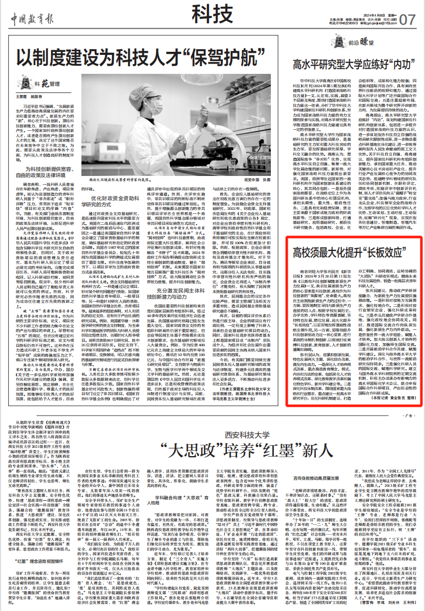 4月8日,《中国教育报》以《高校须最大化提升“长板效应”》为题进行了转载。
