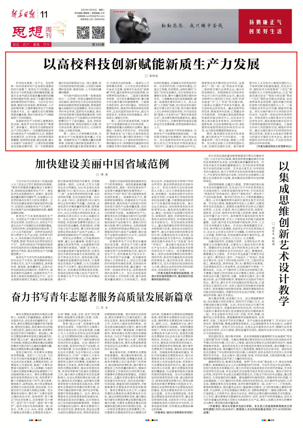 3月26日,《新华日报》刊发了校党委书记张利民的署名文章《以高校科技创新赋能新质生产力发展》。