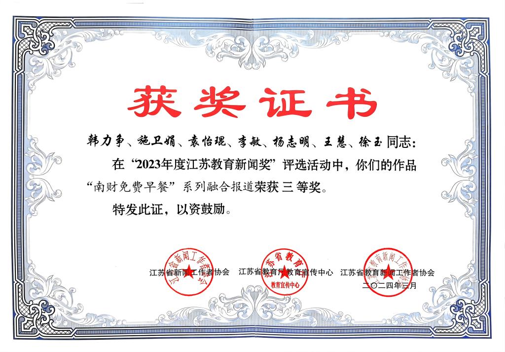 近日,由江苏省新闻工作者协会、江苏省教育厅教育宣传中心(江苏教育报刊总社)联合主办,江苏省教育新闻工作者协会承办的“2023年度江苏教育新闻奖”评选结果公布。我校报送的融合报道类作品《“南财免费早餐”系列融合报道》(作者:韩力争、施卫娟、袁怡琨、李敏、杨志明、王慧、徐玉)获三等奖。