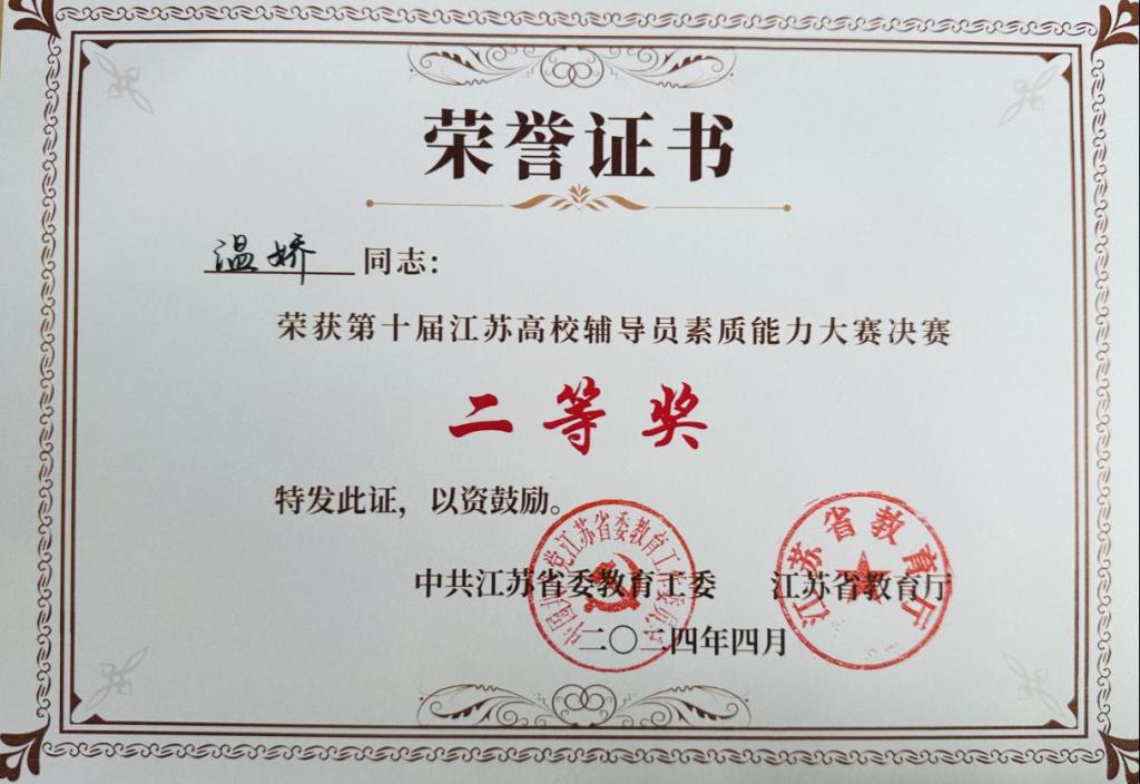 4月19日至20日,第十届江苏高校辅导员素质能力大赛决赛举行。本次大赛由江苏省委教育工委、江苏省教育厅主办,南京医科大学承办。复赛由全省7个高校辅导员研修基地组织开展,共推选出40位选手晋级决赛。我校会计学院辅导员温娇凭借过硬的基本功,在决赛中表现出色,斩获二等奖,取得我校辅导员在此类省级竞赛中的历史最好成绩。