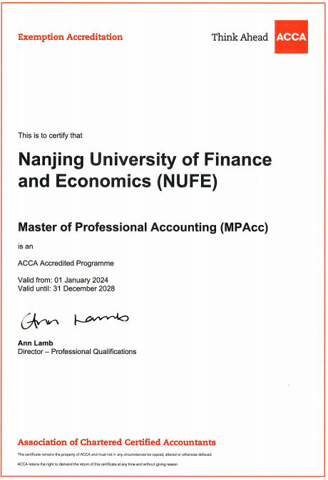 近日,我校会计专硕(MPAcc)一次性通过了英国特许公认会计师公会(The Association of Chartered Certified Accountants,以下简称ACCA)的审核与评估,获得ACCA专业资格考试九门免试认证,成为江苏省首家获得此项认证的高校。
