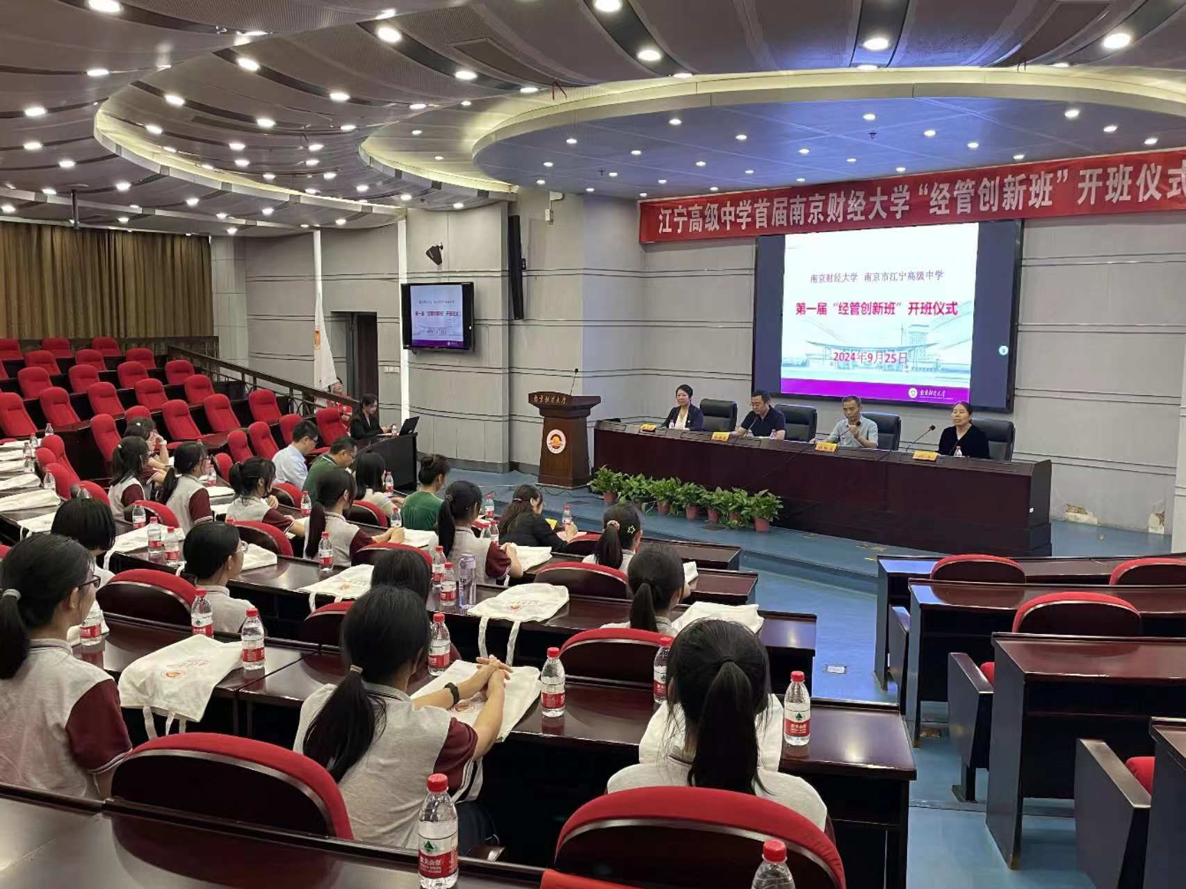 为深化与优质生源基地的交流合作,积极探索高高联合人才培养模式的新路径,9月25日下午,江宁高级中学首届南京财经大学“经管创新班”在仙林校区行政楼二楼报告厅举行开班仪式。江宁高级中学校长张格波、民族管理办公室主任许铁丰、高二年级副主任任智,我校党委常委、副校长赵国栋,党委学生工作部部长、学生处处长韩力争,学生处副处长、招生办公室主任全真真,工商管理学院党委书记张杰、副书记尹海燕以及江宁高级中学首届“经管创新班”的38名学生参加仪式。