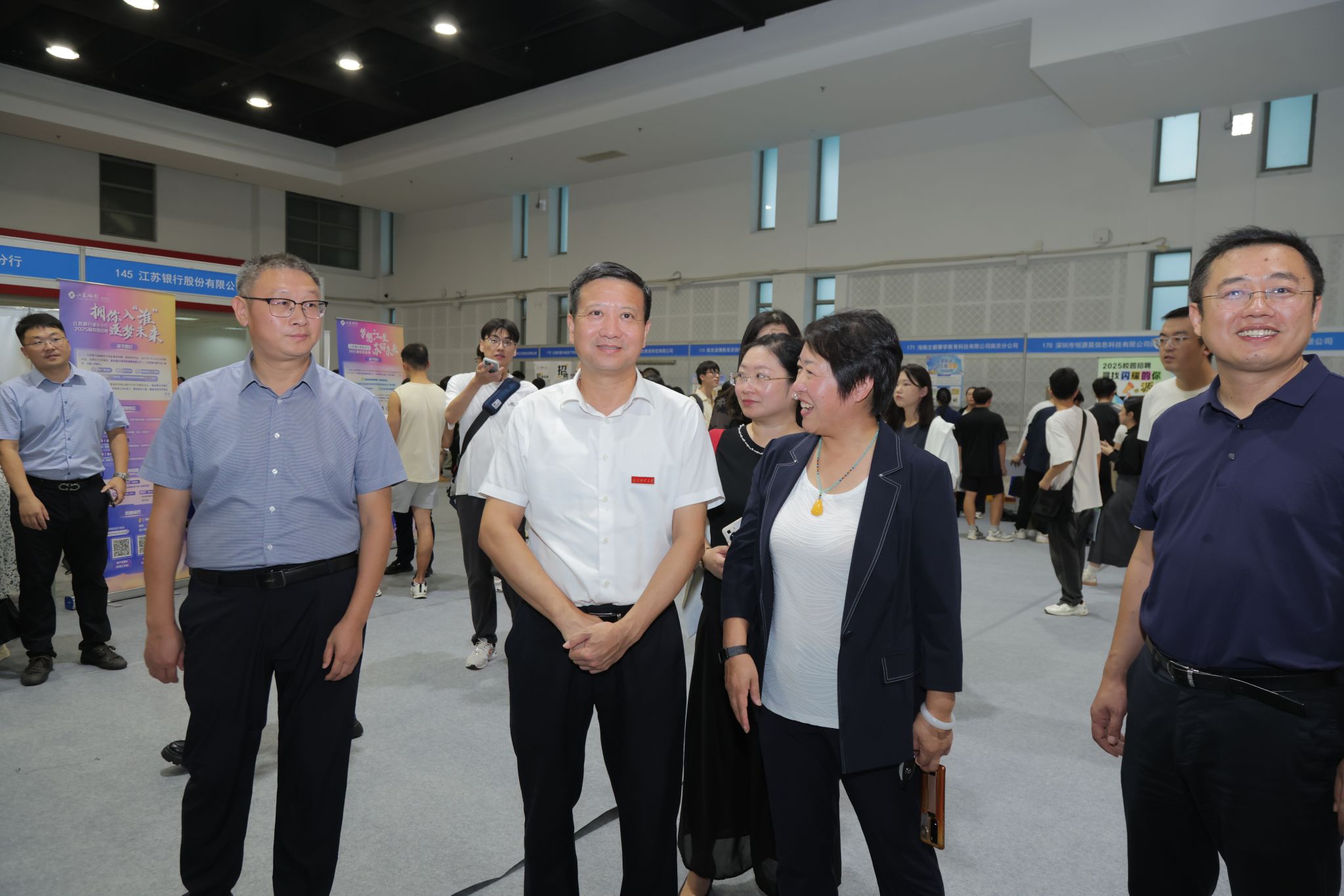为落实党中央、国务院“稳就业”“保就业”的决策部署,把握毕业生秋招关键求职节点,切实促进毕业生更高质量就业,9月27日下午,“服务新质生产力 校地融合 强链兴企促就业”2025届毕业生秋季专场招聘会在仙林校区体育馆举行。校党委书记张利民,校长程永波,党委常委、副校长赵国栋,党委常委、组织部长吕戎亲临现场,与参会企业代表和学生亲切交谈,了解用人需求。党委学生工作部部长、学生处处长韩力争,党委研究生工作部部长郝园园,党委保卫部部长刘伟华,教务处处长朱红根及相关职能部门领导到现场指导学生参加双选会。我校2025届毕业生、部分离校未就业毕业生参加招聘会。