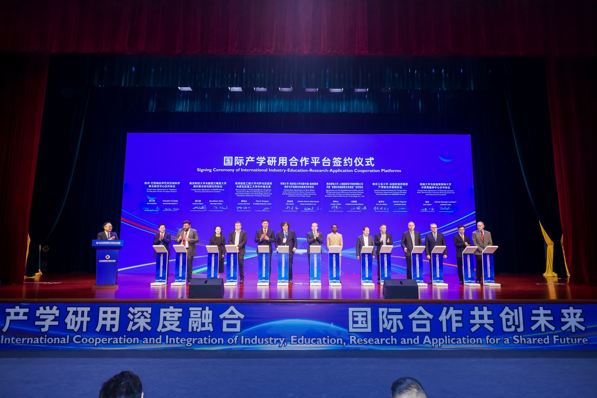 开幕式上,美国史蒂文斯理工学院校长Nariman Farvardin作为首位嘉宾代表与会外方高校致辞。江苏8所高校与外方高校分别签署国际产学研用合作平台共建协议,我校党委常委、副校长姚文韵与新西兰梅西大学副校长Jonathan Elms代表两校共同签署了海外联合研究院共建协议。我校食品科学与工程学院的“中马埃合作环境胁迫下粮油保质减损关键技术和装备联合研发与示范”成果入选“江苏高校国际产学研用十大成果”,并在开幕式上发布。