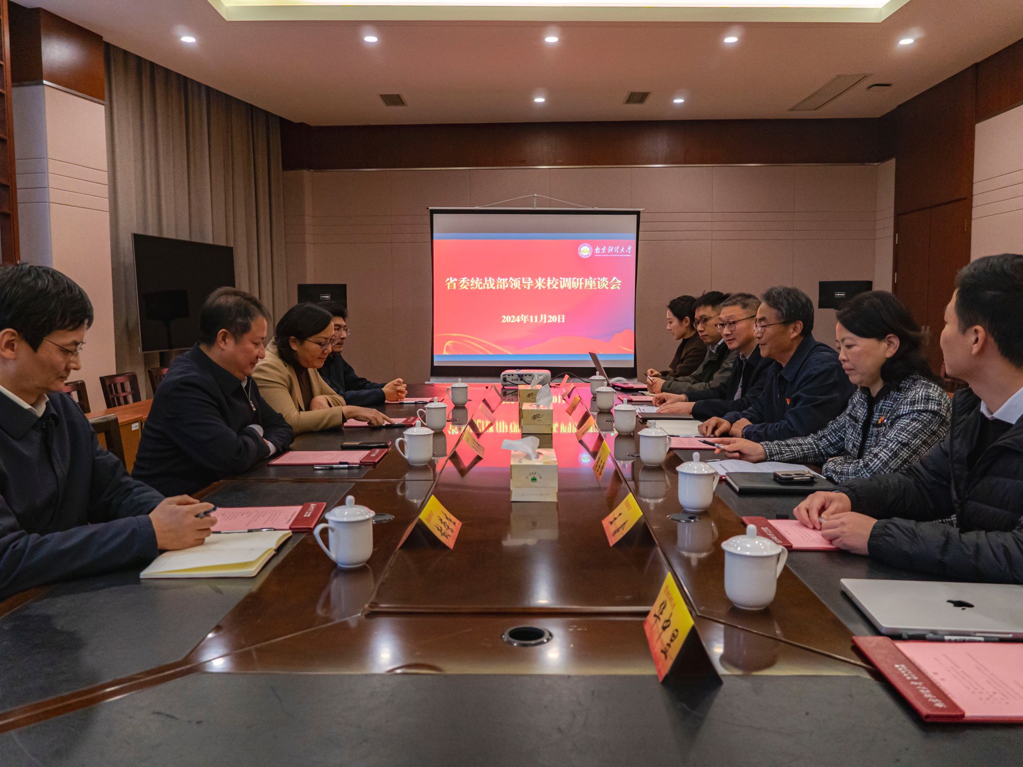 11月20日下午,省委统战部副部长徐东海一行来我校调研江苏省统战理论研究基地工作。校党委书记张利民,校党委副书记李群,党委常委、统战部部长李玉琴陪同调研,省委统战部研究室主任梁永琴、副主任封荣生,我校党政办主任郑锷,教务处处长、省统战理论研究基地执行主任朱红根,以及党政办、党委统战部、经济学院、档案馆等单位相关同志参加调研。