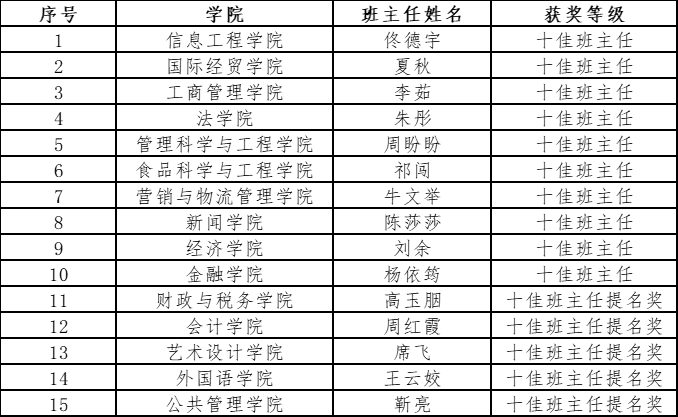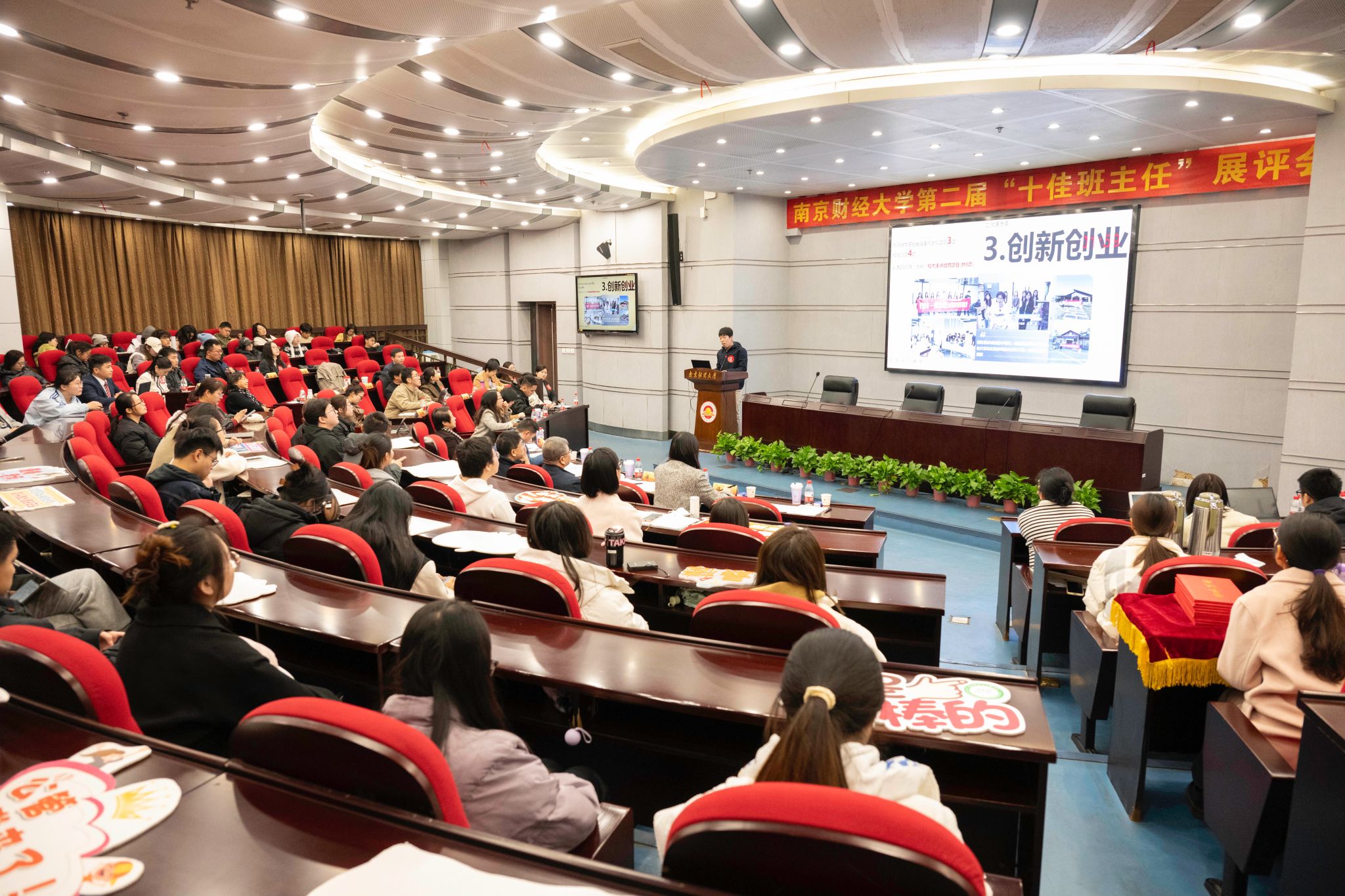 为进一步推进我校班主任队伍建设,提升班主任的专业素养和育人能力,加强优秀班主任典型事迹和工作经验的宣传交流,12月4日下午,我校第二届“十佳班主任”展评会在仙林校区行政楼二楼报告厅举办。党委常委、副校长赵国栋出席展评会并颁奖,南京师范大学学生工作处处长兼党委学生工作部部长景飞,南京信息工程大学学生工作部部长、学生工作处处长李健,我校党委教师工作部部长、人事处处长杨文建,党委研究生工作部部长郝园园,党委学生工作部部长、学生处处长韩力争担任评委。党委学工部思政科工作人员,各学院班主任代表、辅导员代表和学生代表到场学习观摩。展评会由金融学院辅导员刘天钰主持。
