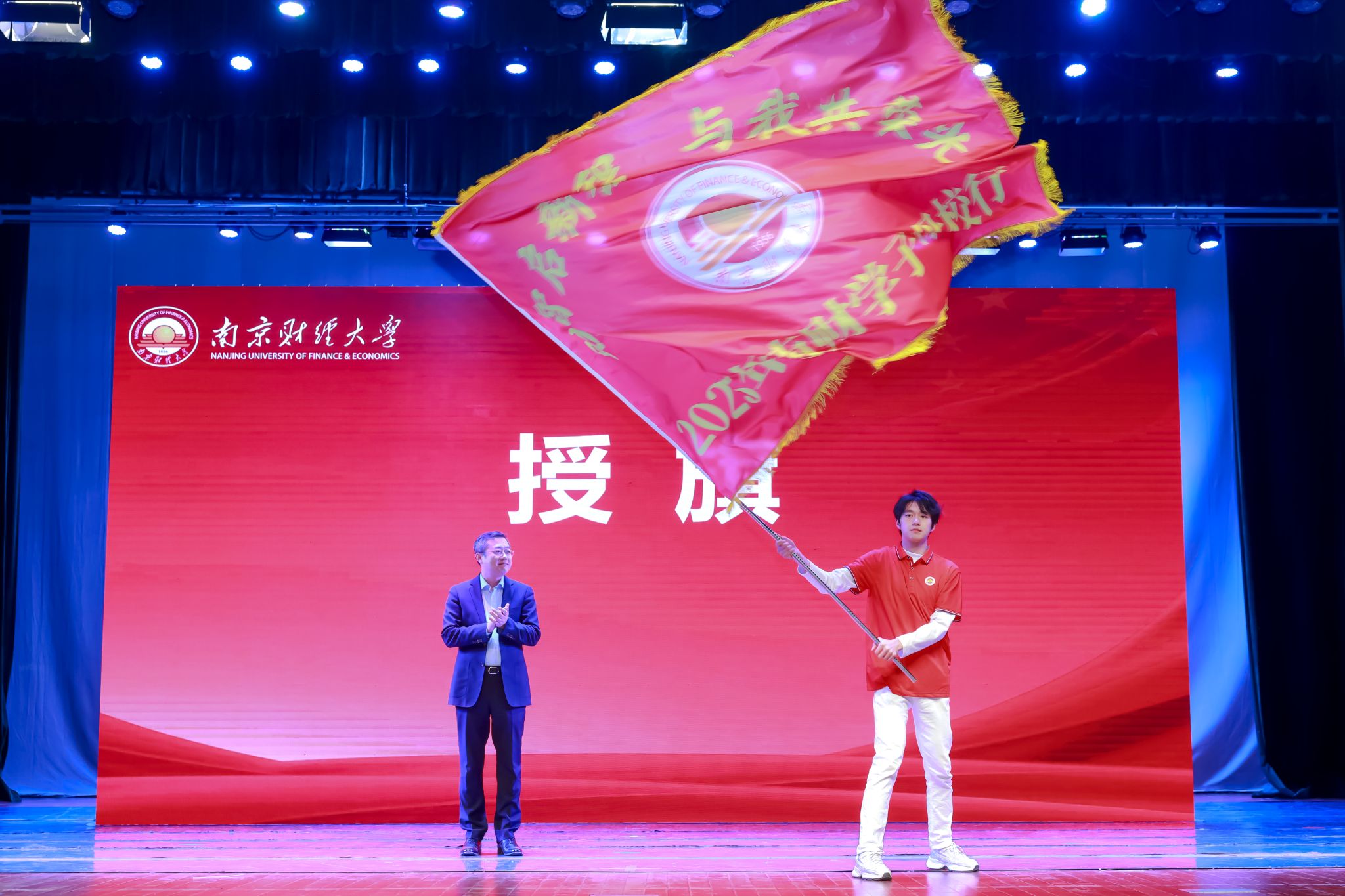赵国栋副校长为志愿者代表授“财智启新程,与我共荣光”2025年南财学子母校行出征旗。一面旗帜,就是引领众帆的号角,也是不负众望的寄托。志愿者学生代表接过出征仪式的旗帜,各团队正式踏上了新的征程。
