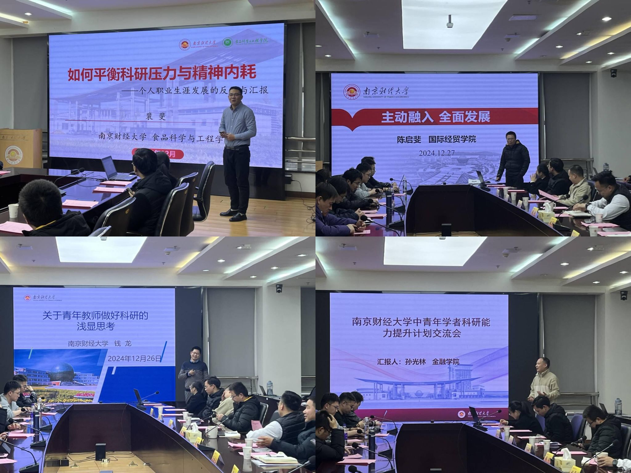 12月26、27日,我校在仙林校区行政楼16楼会议室举办中青年学者科研能力提升计划系列讲座。食品科学与工程学院裴斐、国际经贸学院陈启斐、粮食和物资学院钱龙、金融学院孙光林受邀作了主题为“高校教师职业生涯规划与发展”的学术讲座。本次活动由科学研究院,党委教师工作部、人事处,青年教师发展委员会共同主办。活动由副校长张炳主持。