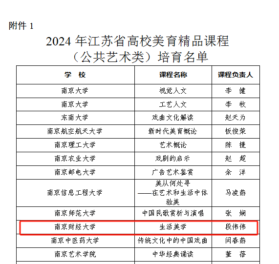 近日,省教育厅公布了2024年江苏省高校美育精品课程(公共艺术类)培育名单,此次评选共收到全省106所高校申报课程168门,最终遴选30门课程进入培育名单。我校艺术教育中心主任段伟伟课程团队申报的“生活美学”课程成功入选。