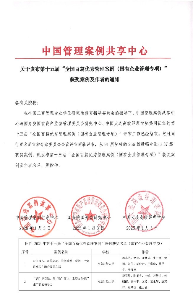 近日,全国工商管理专业学位研究生教育指导委员会发布第十五届“全国百篇优秀管理案例(国有企业管理专项)”入选名单。我校李召敏、韩小芳两位老师及其团队编写的2篇案例在众多投稿中脱颖而出,成功入选。2024年,我校共计7篇案例入选“全国百篇优秀管理案例”,入选数量为历年最高。