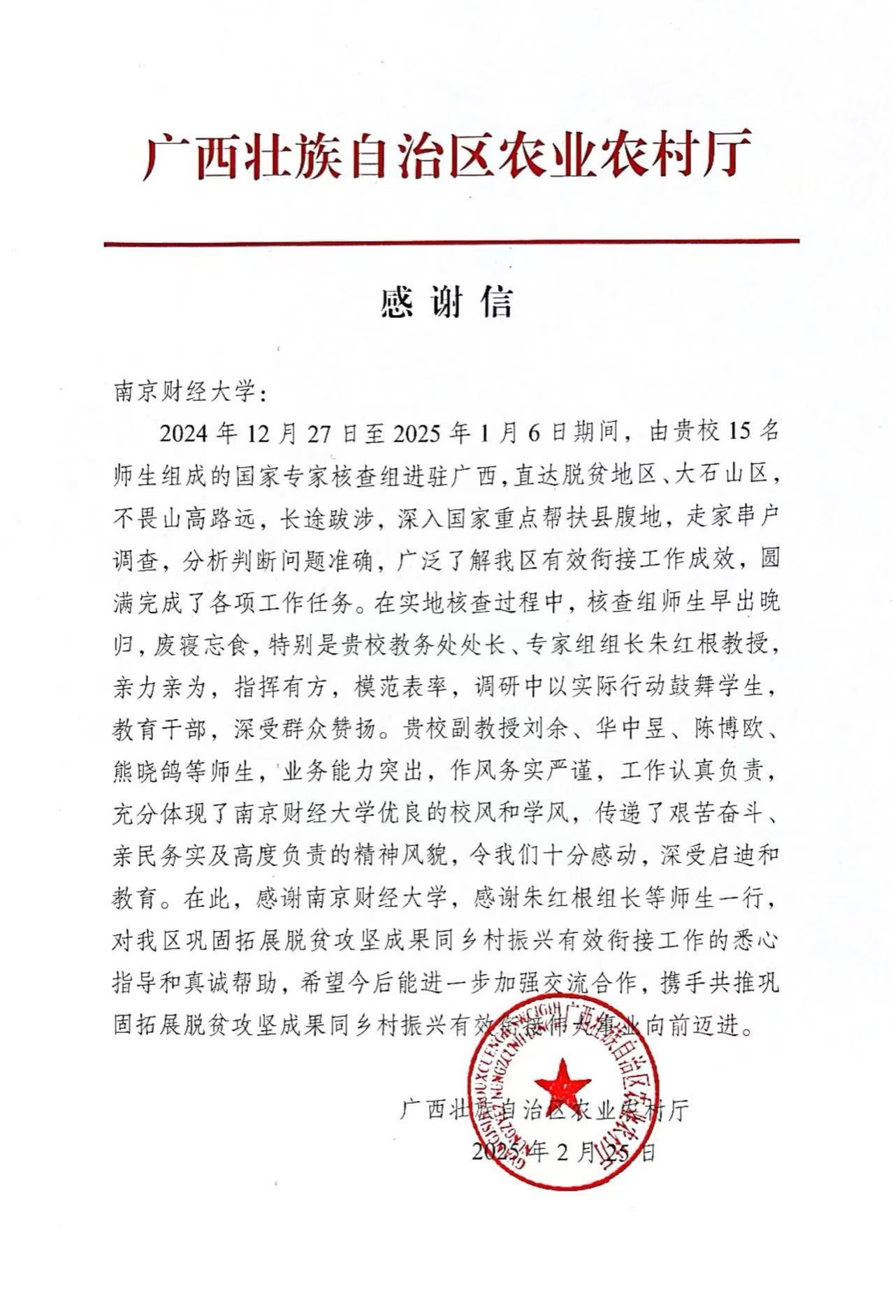 广西农业农村厅在感谢信中表示,南京财经大学核查组的辛勤付出和科学指导为广西乡村振兴事业注入了强劲动力,期待未来进一步深化合作,共同推动巩固拓展脱贫攻坚成果同乡村振兴有效衔接迈上新台阶。