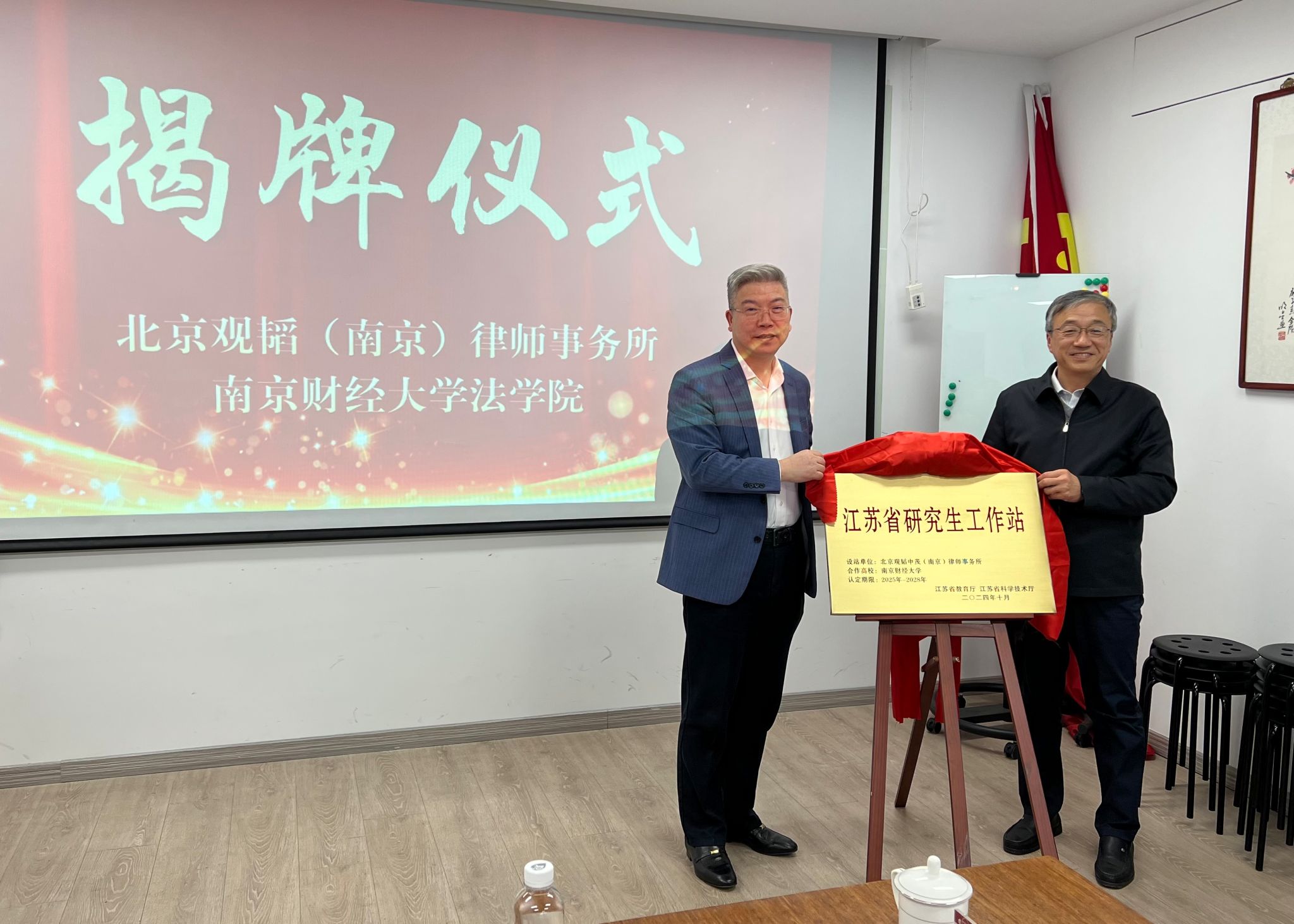 3月18日,“法研启航,智汇未来”江苏省研究生工作站揭牌仪式在北京观韬(南京)律师事务所举办。党委常委、纪委书记李茜,北京观韬(南京)律师事务所主任来云龙,执行主任倪军、辛长洲,品牌委主任王政,外联委主任张方强,高级合伙人孙扬广等出席仪式,我校法学院领导以及师生代表参加仪式。