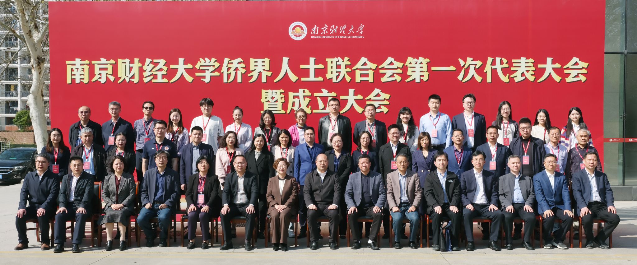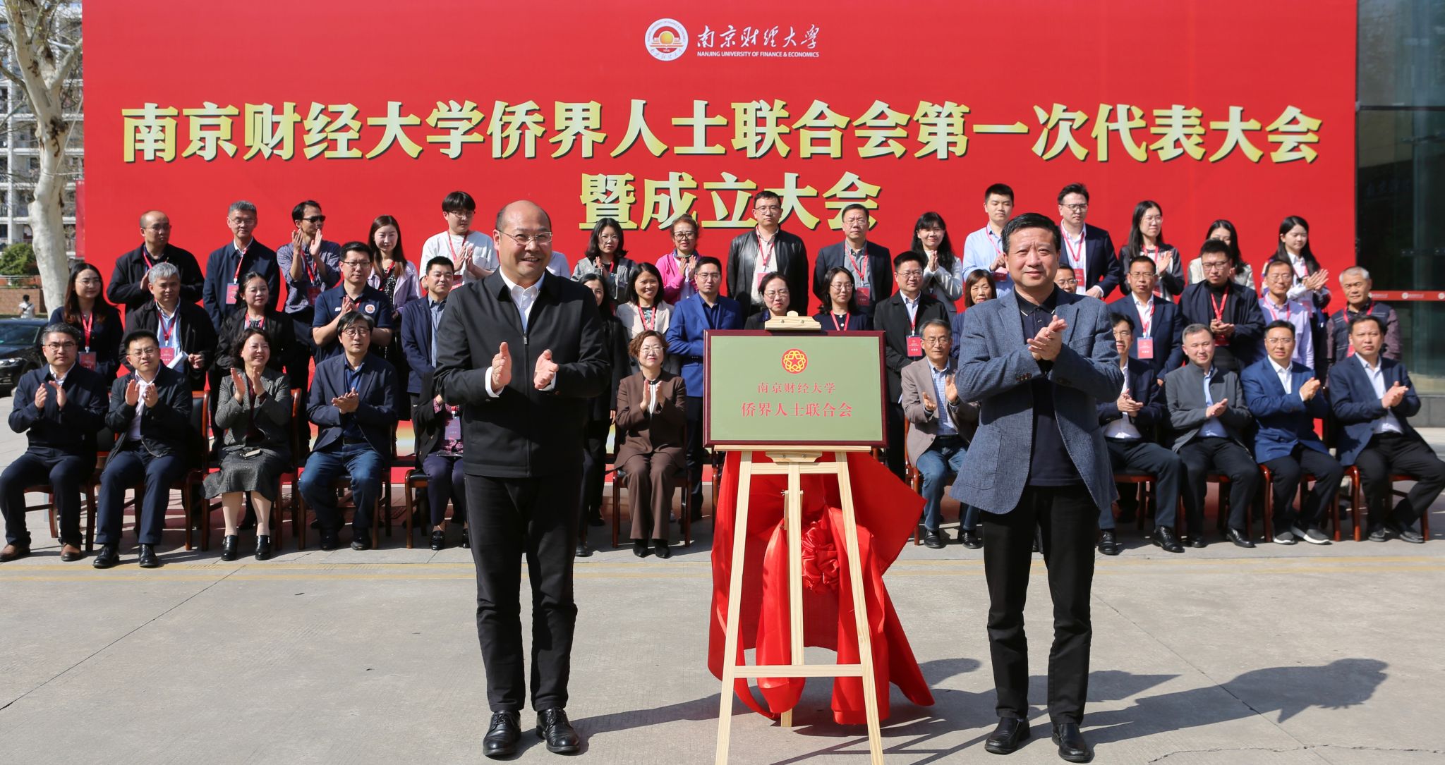 会议开始前,张利民书记与刘标主席在工科楼前广场共同为“南京财经大学侨界人士联合会”揭牌。随后,全体与会人员合影留念。
