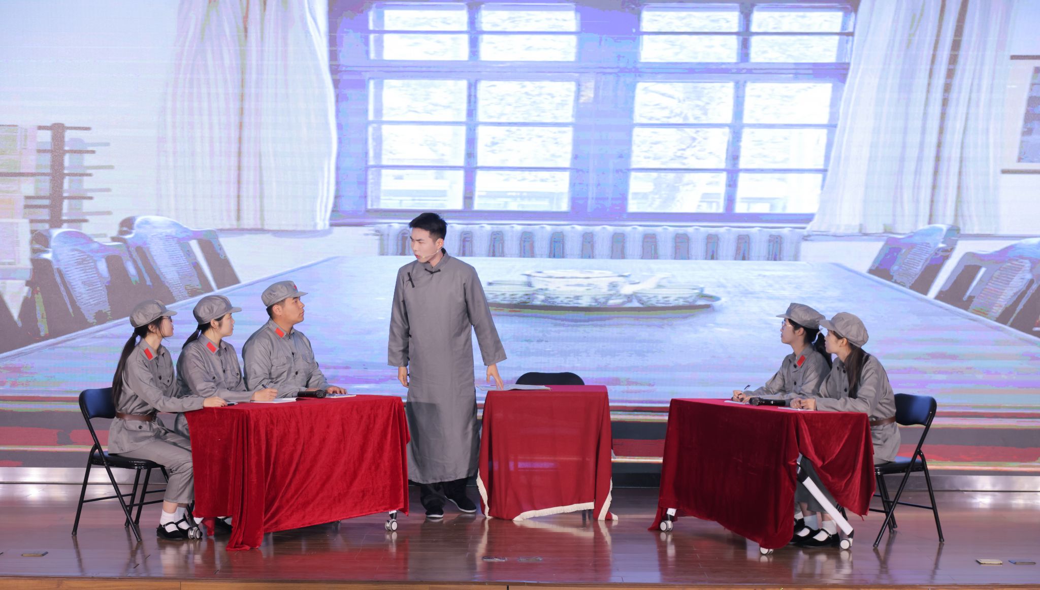 经济学院团员青年们创新演绎了红色情景剧《擎旗御侮雨花英烈——罗登贤》,生动再现了1931-1933年间罗登贤从肇创东北抗日人民武装到组织工人、学生罢工游行,最终于南京雨花台英勇就义的壮烈事迹。