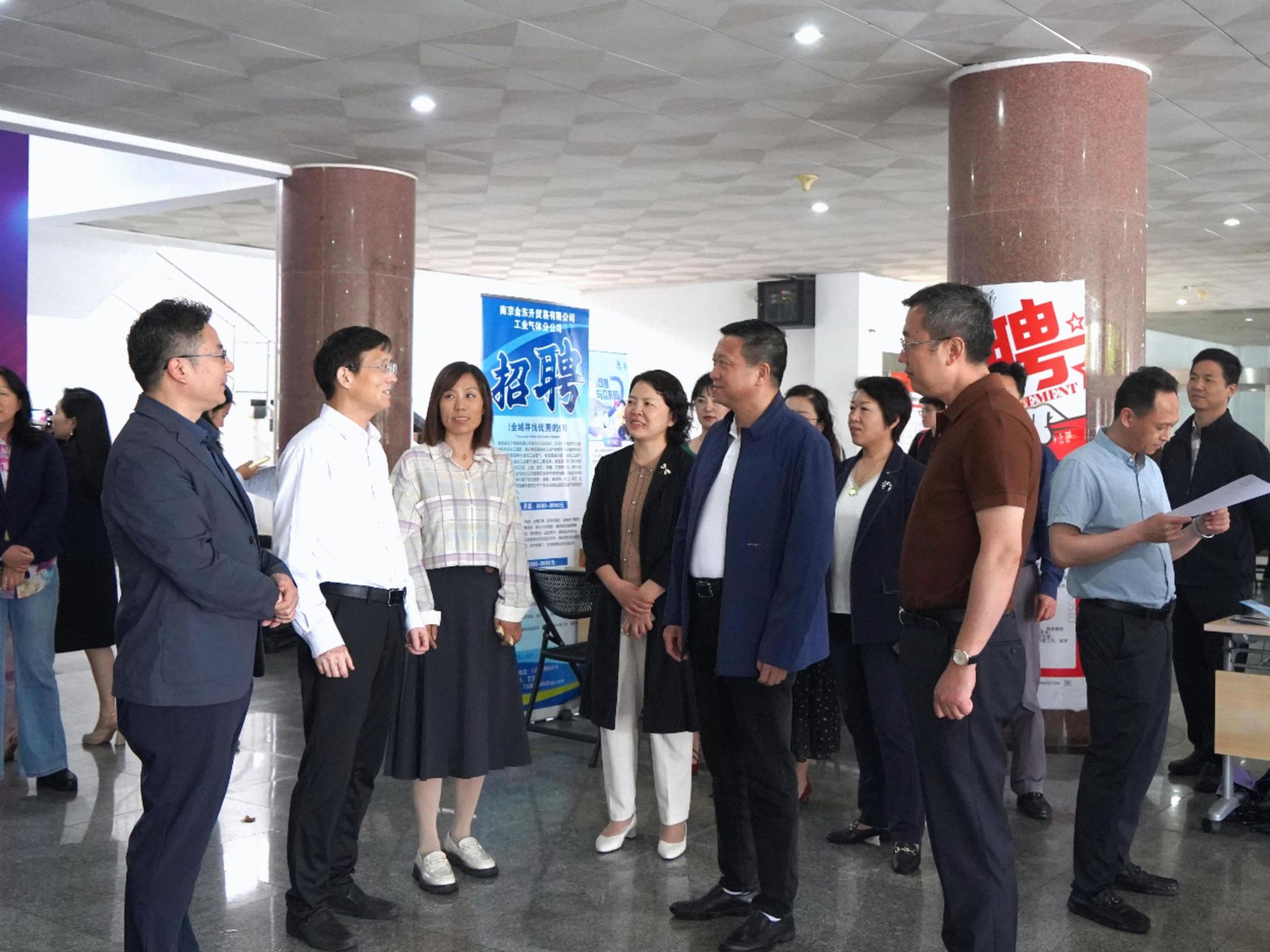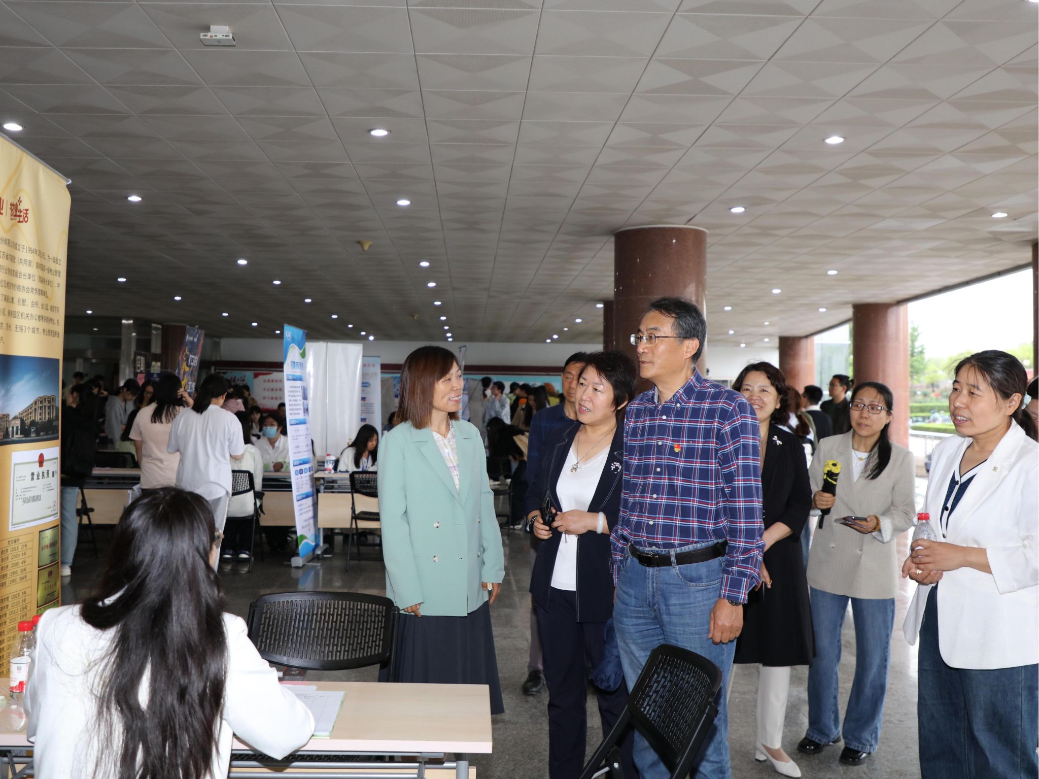 5月8日下午,“企业进校园 同心促就业”专场招聘会在仙林校区博观楼大厅举行。校党委书记张利民,校党委副书记李群,党委常委、副校长赵国栋,党委常委、统战部部长李玉琴,栖霞区委统战部副部长、区工商联党组书记王俊,民建江苏省直工委副主委王鸿博,民建南京市委会秘书长兼办公室主任何洋,栖霞区工商联党组成员、副主席彭中华等深入会场,与参会企业代表和学生深入交流,了解用人单位和毕业生需求。我校党政办、党委统战部、党委学生工作部、民建基层委员会等部门负责人,工商管理学院、管理科学与工程学院等学院领导和辅导员到场指导学生参加招聘会。