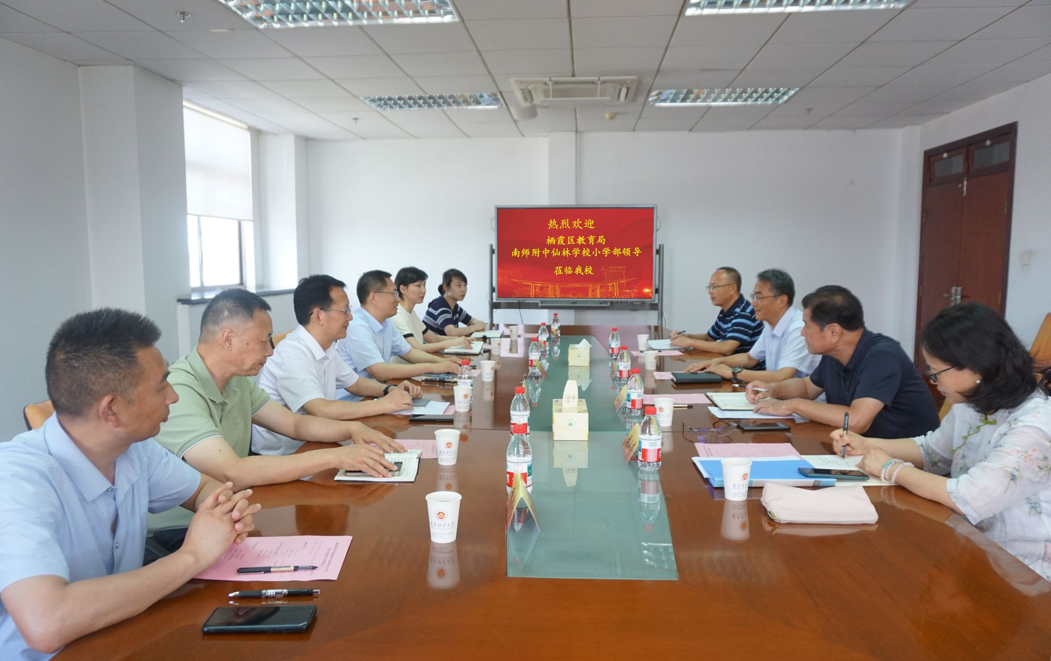 6月17日上午,栖霞区教育局局长倪天华一行来我校调研交流,调研交流会在仙林校区行政楼1201会议室召开。校党委副书记李群,栖霞区教育局局长倪天华、副局长陈婷婷,南师附中仙林学校小学部书记肖全胜、校长朱永刚、副校长季春雷出席会议,栖霞区教育局办公室、南师附中仙林学校小学部、我校党委宣传部和工会相关领导参加会议。