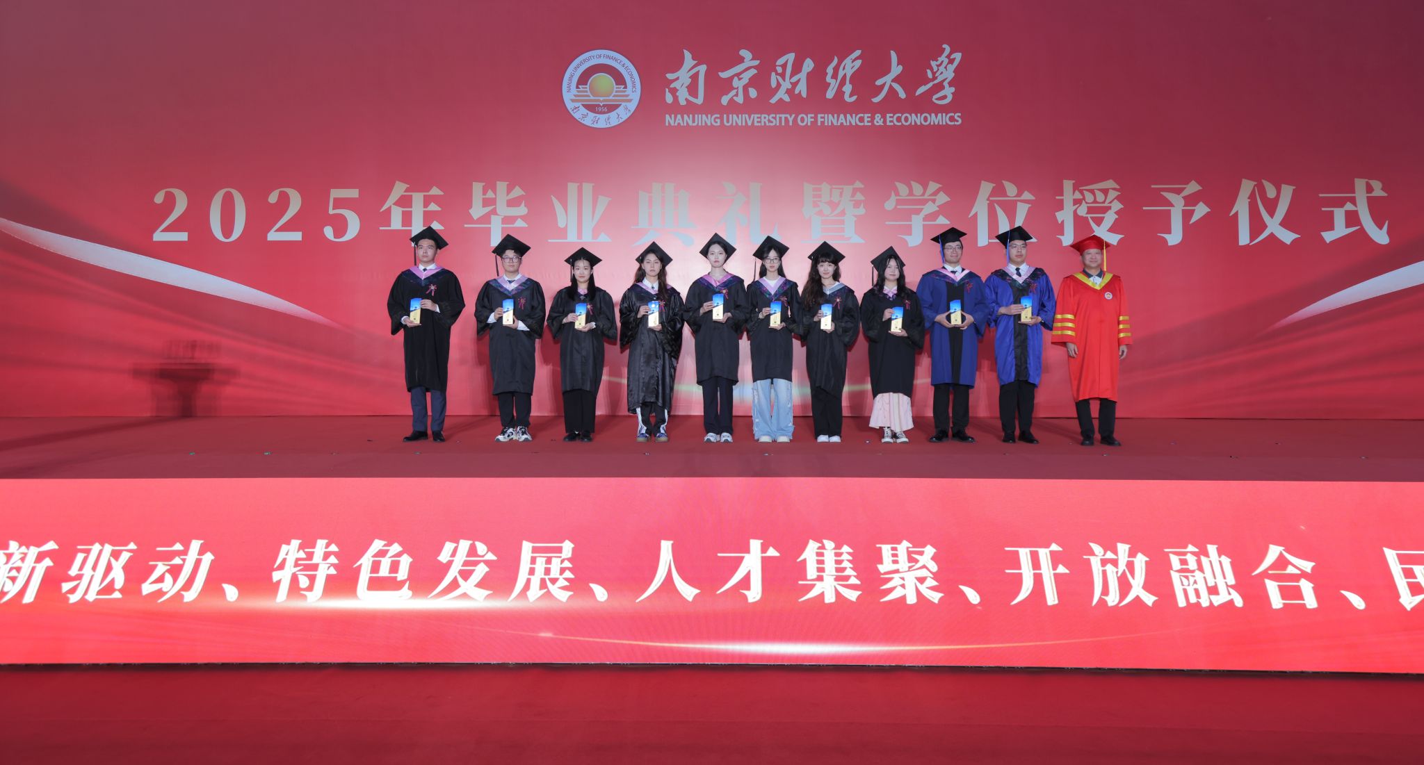 全体毕业生紧握右拳,庄严宣誓。在铿锵有力的毕业誓词和悠扬的《南财大之歌》中,2025届毕业生的青春故事翻开了新的一页。