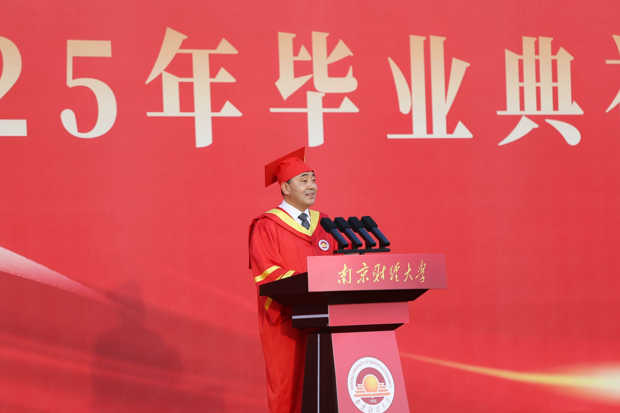 毕业典礼在雄壮的国歌声中拉开帷幕。程永波校长以《挺膺担当 务实进取》为题致辞。他代表学校向2025届全体毕业生致以最热烈的祝贺,向辛勤培育他们的师长、一路相伴的家人,致以最崇高的敬意和最诚挚的感谢。程永波校长以饱含温情的“镜像”语言,再现了2025届学子一个个闪光的“南财瞬间”,回顾了大家砥砺前行的成长历程,讲述了大家以理想为帆、以拼搏为桨、以信念为舵的奋斗篇章。所有可爱的毕业生们都以特有的方式诠释了青春最美的模样,书写了动人的南财故事。
