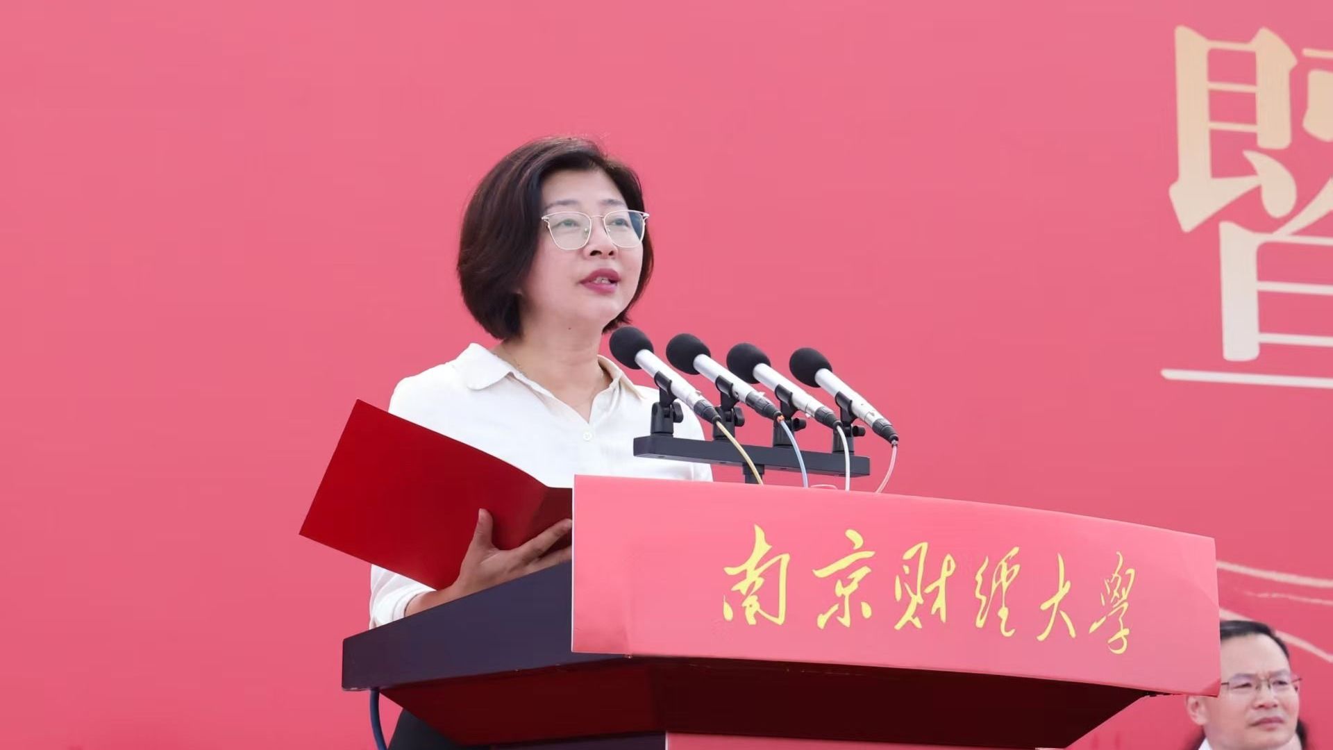 嘉宾代表、江苏省南通市海门实验学校校长黄芳发言。她勉励新生将小我融入大我,以青春奉献家国;心有所信、韧以成事、融通致用,在南财汲取知识、锤炼品格、拓宽视野、结交挚友,最终成长为更好的自己。