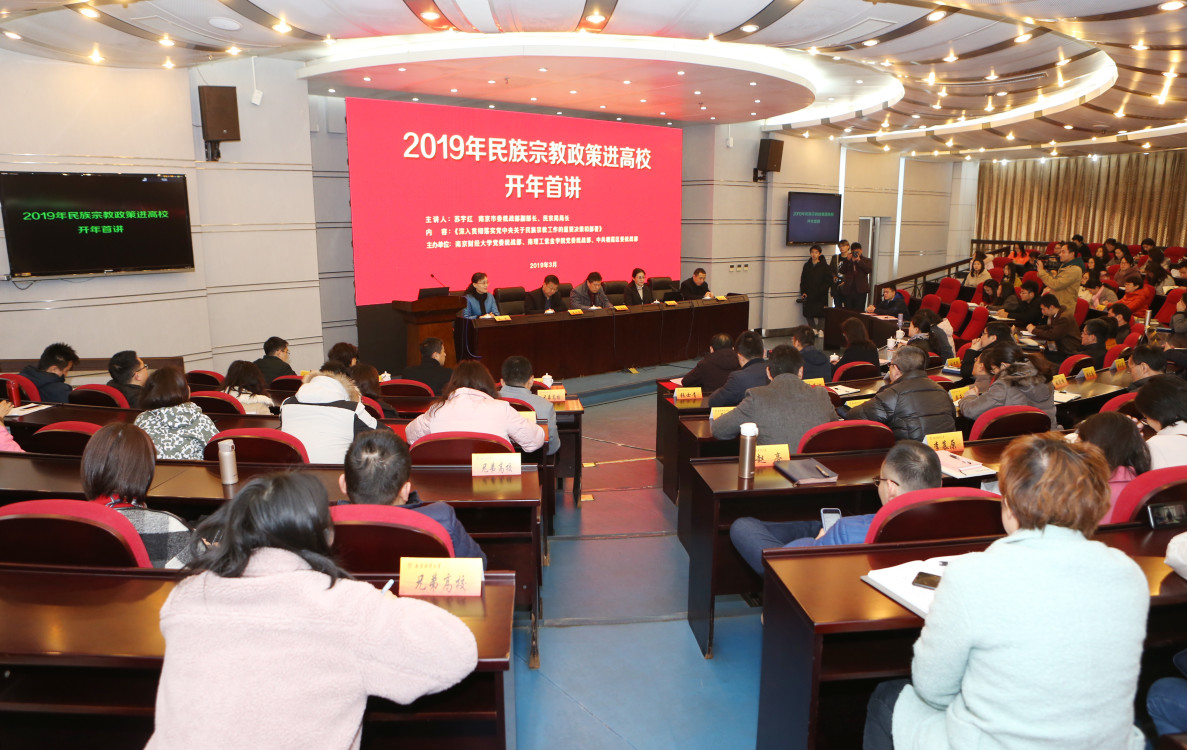 3月8日上午,我校社会主义学院成立后的第一期培训——“2019年民族宗教政策进高校开年首讲活动”在仙林校区行政楼二楼报告厅举办。活动邀请了南京市委统战部副部长、市民族宗教事务局局长苏宇红做民族宗教政策解读。校党委副书记温潘亚出席活动并讲话。栖霞区委常委、统战部部长尹军,副区长袁文峰,民宗局局长盛艳等领导嘉宾出席活动。活动由校党委常委、统战部部长吕戎主持。
