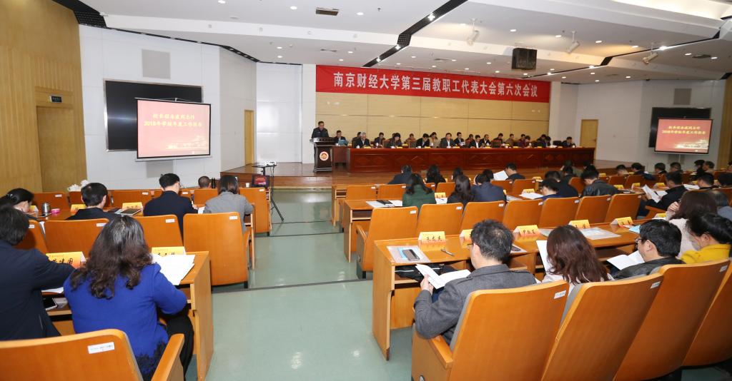 程永波校长作《南京财经大学2018年度工作报告》。报告全面回顾和总结了我校2018年工作,并对2019年重点工作作了整体部署。程永波校长指出,2018年,学校以习近平新时代中国特色社会主义思想为指导,围绕立德树人根本任务,按照高质量发展要求,改革创新、开拓进取,大力提升内涵建设水平,学校各方面工作取得显著成效,综合实力稳步提升。主要体现在:全面落实“十三五”规划,综合改革持续深化;推进教育教学改革,人才培养质量不断提高;大力推进博士学位授予单位建设,学科建设水平稳步提升;强化科研过程管理和产出管理,科研工作取得显著进展;大力推进协同创新,社会服务能力有效增强;落实人才集聚战略,人才队伍建设扎实推进;深化国际合作与交流,开放办学取得新成效;提升科学管理水平,办学保障体系日益完善;落实全面从严治党新要求,党建科学化水平不断提高。