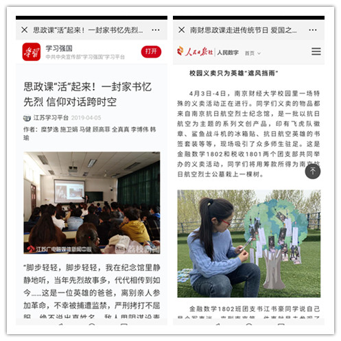 与先烈时空信仰对话、一封家书致敬烈士、校园义卖只为英雄“遮风挡雨”、以诵读表达思念之情……清明节来临之际,我校思政课走进传统节日,将爱国之情融入学生心里。学习强国、人民日报社人民数字、中国社会科学网、中国新闻网江苏、新华网江苏、中国日报网等媒体以“思政课‘活’起来”“将思政教育与传统节日有机融合”等为题纷纷报道了这一思政课创新形式。