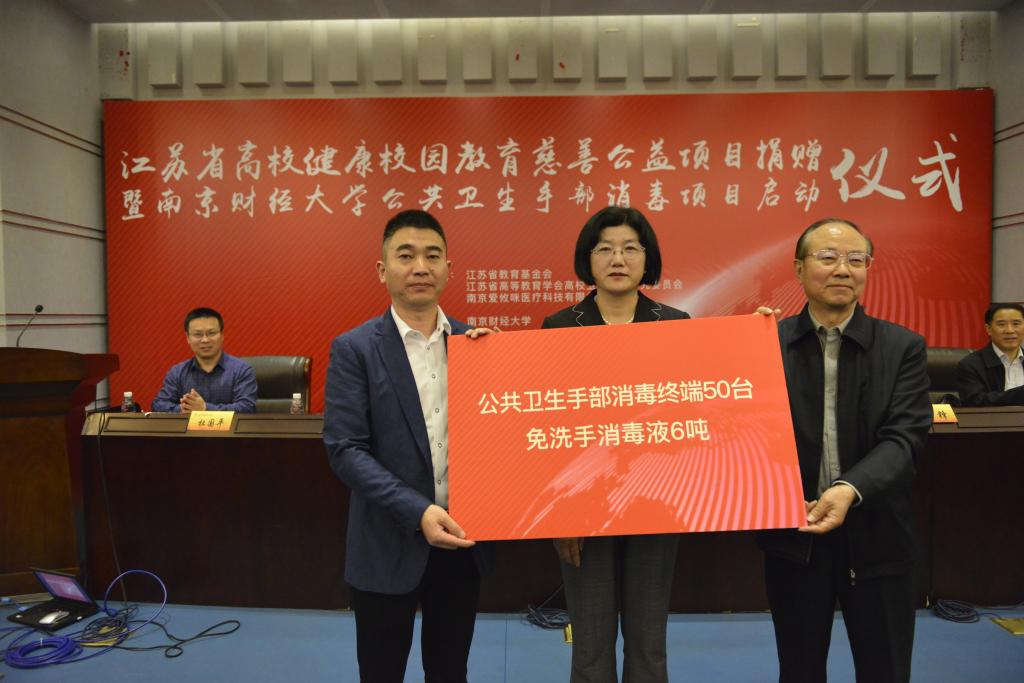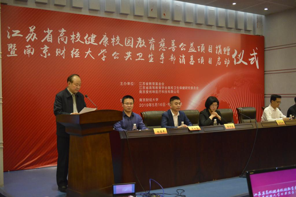 5月16日下午,江苏省高校健康校园教育慈善公益项目捐赠暨南京财经大学公共卫生手部消毒终端项目启动仪式在我校仙林校区行政楼二楼报告厅举行。江苏省教育基金会理事长祭彦加、常务副理事长兼秘书长步锦昆,南京爱攸咪医疗科技有限公司董事长吴从喜,江苏省高等教育学会高校卫生保健研究委员会秘书长杜国平,南京农业大学、南京财经大学等17所高校的校领导和有关职能部门的人员参加了捐赠启动仪式。