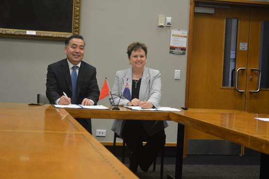 5月10日上午,代表团首先来到位于新西兰北帕默斯顿市的梅西大学(Massey University)进行访问。梅西大学校长Jan Thomas对程永波校长一行的访问表示热烈欢迎,并简要介绍了梅西大学的学校历史、学科特色和最新发展。程永波校长对Jan Thomas校长的热情接待表示感谢,并介绍了我校的学科优势特色、发展情况及其在江苏省经济发展中的地位与作用,希望两校在各层次、全方位进行深度合作,包括学生交流(博士、硕士、本科)、教师合作科研、共建科研机构等。双方在坦诚、务实和友好的气氛中,共同回顾了两校的合作历程和丰硕的合作成果,展望了未来的合作潜力和美好前景。会谈后,程永波校长与Jan Thomas校长签订了本科及硕士合作培养的两个协议,拓展了两校对本科和硕士学生联合培养的内容。