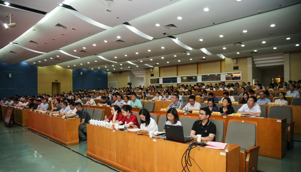 6月5日上午,我校在仙林校区图书馆报告厅召开党群工作会议,深入学习贯彻中央“不忘初心、牢记使命”主题教育工作会议、全省“不忘初心、牢记使命”主题教育动员会议和全省教育大会精神,通报学校近期党建思想政治工作和改革发展有关事项进展情况,部署下一阶段工作。党委书记张利民,党委副书记温潘亚,纪委书记李茜,党委常委、副校长李群,党委常委、组织部部长赵国栋,党委常委、统战部部长吕戎,党委常委、宣传部部长石奇和全体党委委员、纪委委员出席会议。各职能部门主要负责人,各基层党(工)委、党总支书记,各学院院长,各基层党(工)委、党总支副书记,党群部门全体工作人员,各党支部书记,分团委书记以及全体学工秘书、辅导员参加会议。会议由党委书记张利民主持。