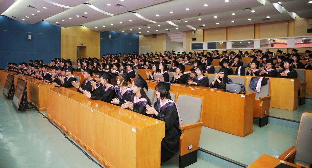 在各学院分管教学副院长宣读《关于授予2019届毕业生学士学位的决定》后,毕业生们身穿学士服走上前台,校领导、学院领导、教授为他们一一拨过学位帽上的流苏,授予学士学位证书。