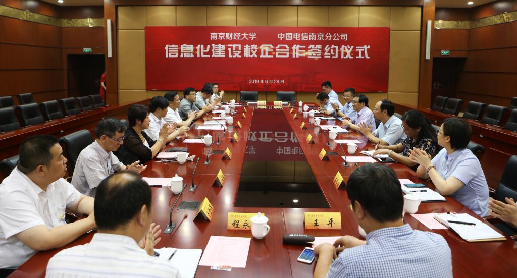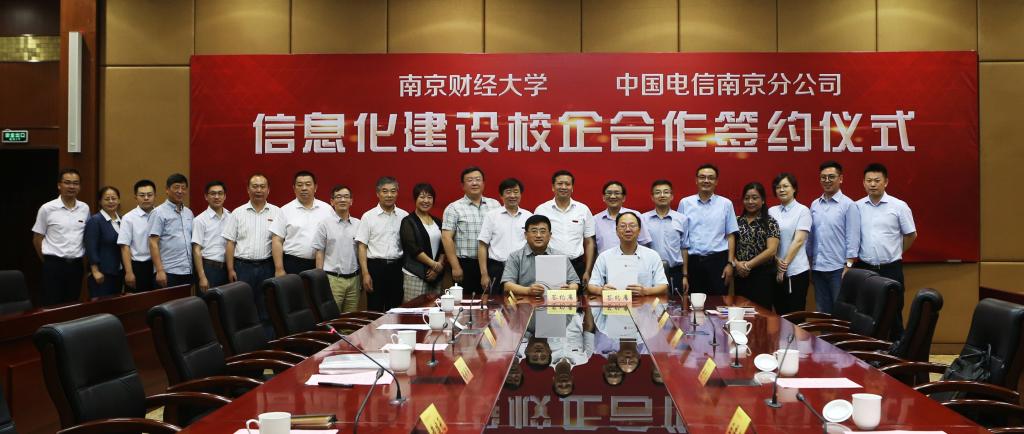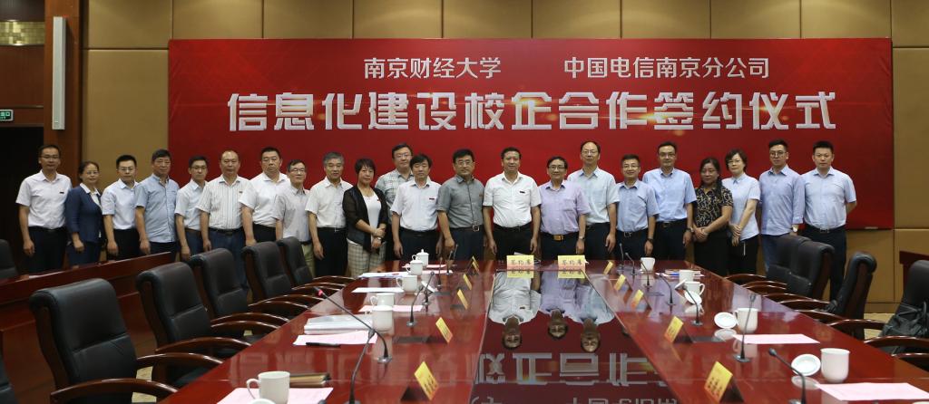 随后,我校党委常委、副校长乔均,中国电信南京分公司党委委员、副总经理王庭文代表双方在《南京财经大学信息化建设校企合作协议》上签字,与会领导一同见证协议签字并合影留念。