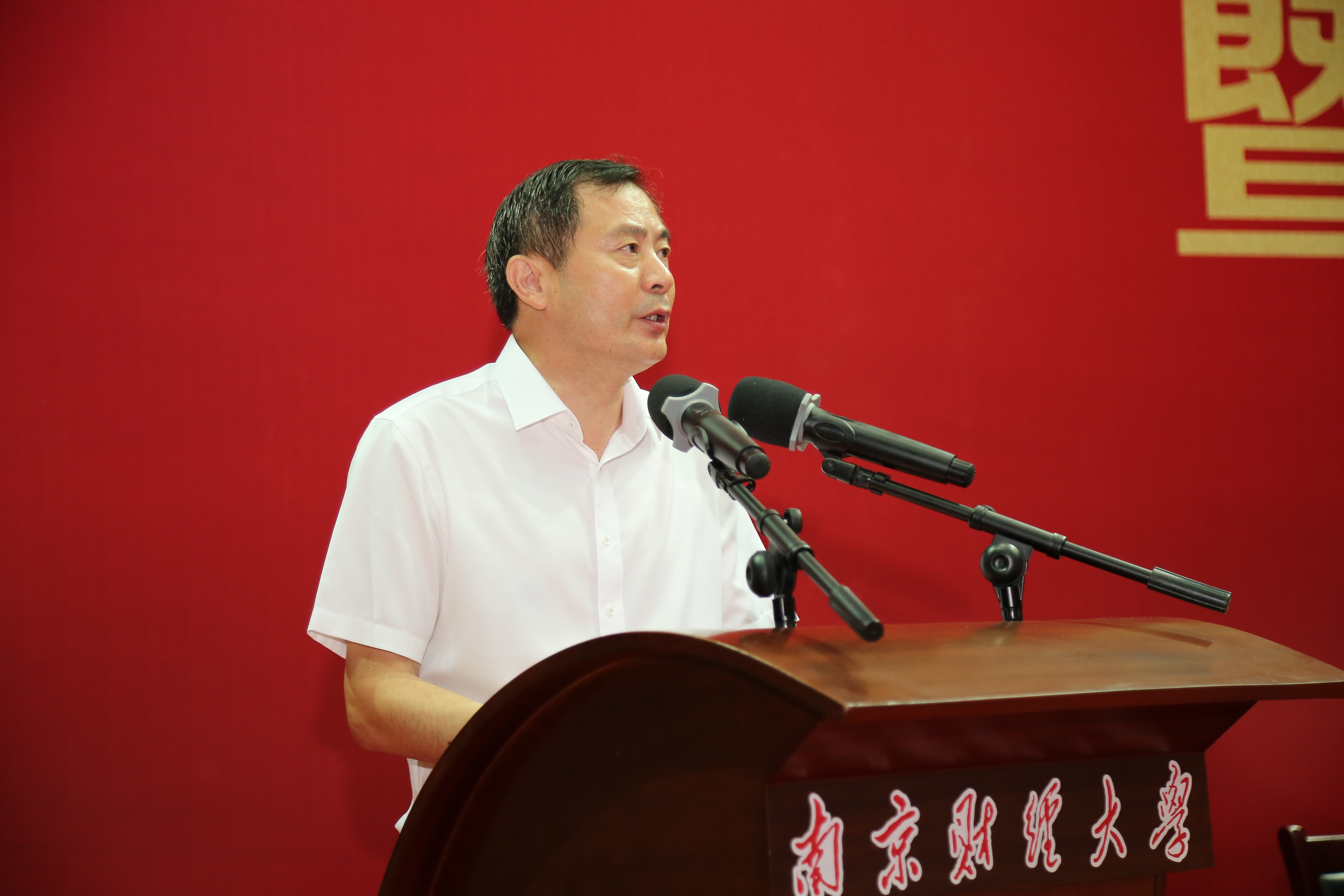 嘉宾代表、我校优质生源基地——江苏省宝应中学校长刘俊发言。他与同学们分享了三个关键词:良心、初心和匠心,希望同学们在南财这座新的熔炉中锻造出生命的亮色!
