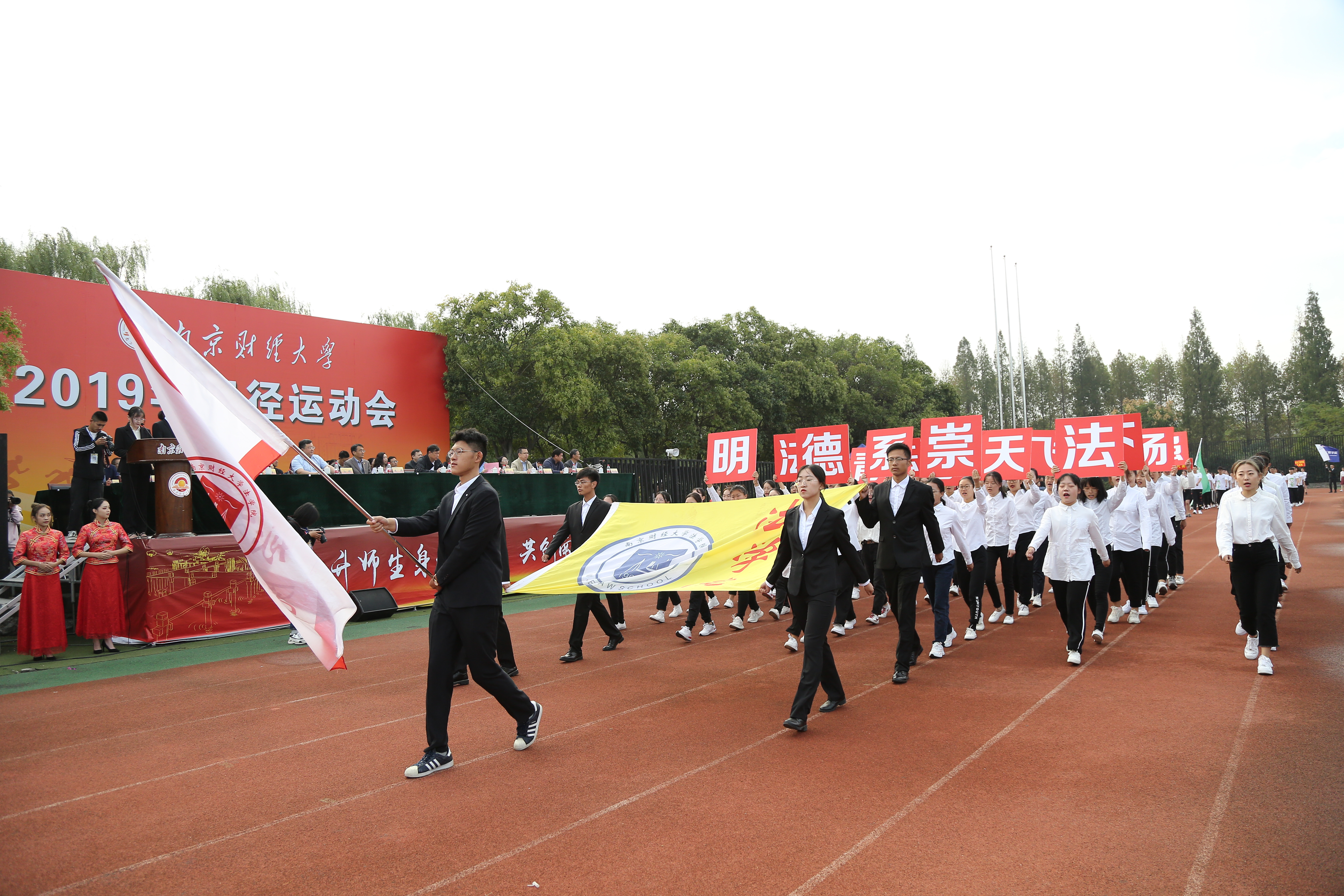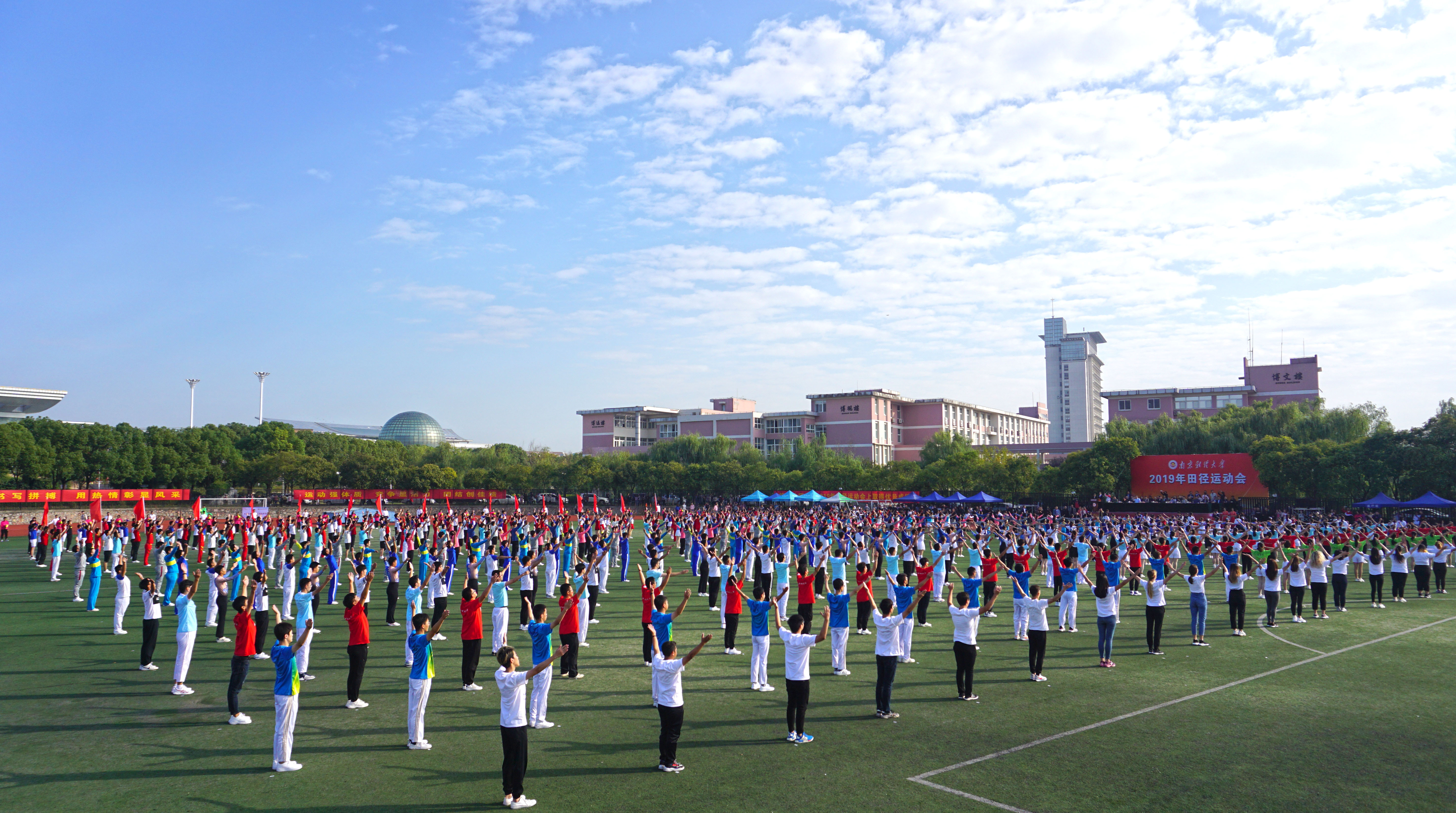 拼搏向上,斗志激昂,运动场上切磋较量;青春无畏,英姿勃发,飒爽金秋登天揽月。10月17日上午,我校2019年田径运动会在仙林校区西苑田径场开幕。校党委副书记温潘亚,副校长时现、李群,校党委常委、宣传部部长石奇出席开幕式,各职能部门、各学院负责人与全体运动员一同参加了开幕式。开幕式由副校长李群主持。