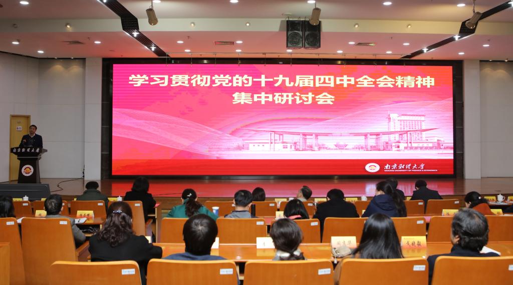 11月25日下午,我校在仙林校区图书馆报告厅召开学习贯彻党的十九届四中全会精神集中研讨会。会议的主要任务是,结合“不忘初心、牢记使命”主题教育,深入学习贯彻党的十九届四中全会精神,动员全校各级党组织和广大党员干部师生把思想和行动统一到全会精神上来,扎实推进学校治理体系和治理能力现代化,更好地保障和推动学校高质量发展。全体校领导出席会议,全体党委委员、纪委委员,全体中层领导干部,全体基层党支部书记,党外人士代表参加会议。会议由校党委书记张利民主持。