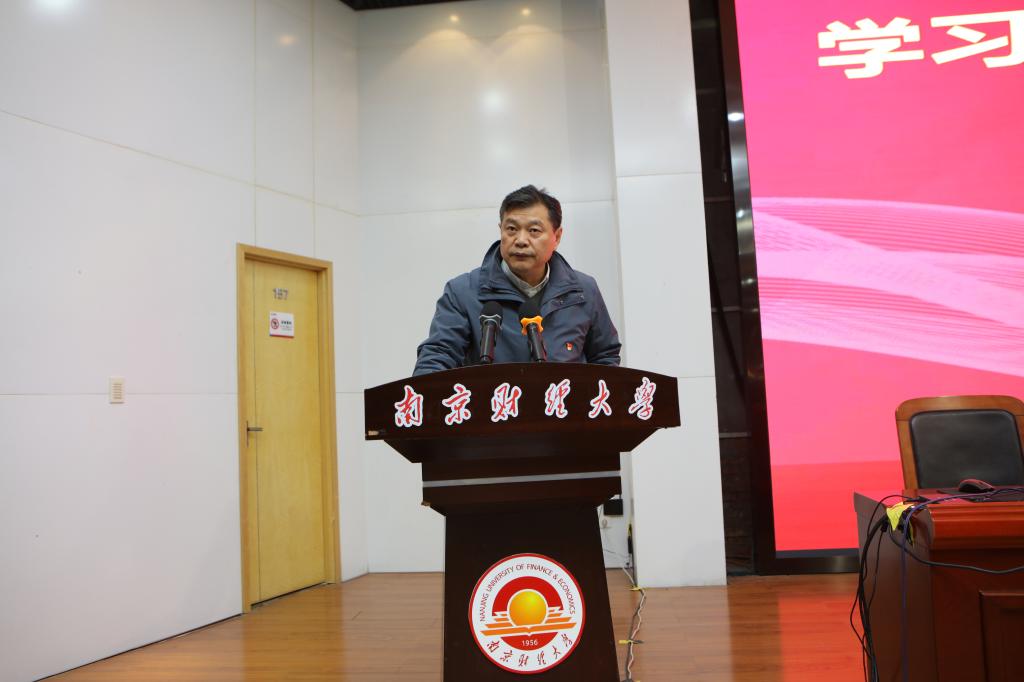 11月27日下午,我校在仙林校区图书馆报告厅召开学习贯彻党的十九届四中全会精神专题报告会暨分组研讨会。全国政协委员、南京大学经济学院教授杨德才作“坚持和完善社会主义基本经济制度,推动经济高质量发展”专题报告。校党委副书记温潘亚出席并主持报告会,全体中层领导干部、全体基层党支部书记、党外人士代表、师生代表参加报告会。