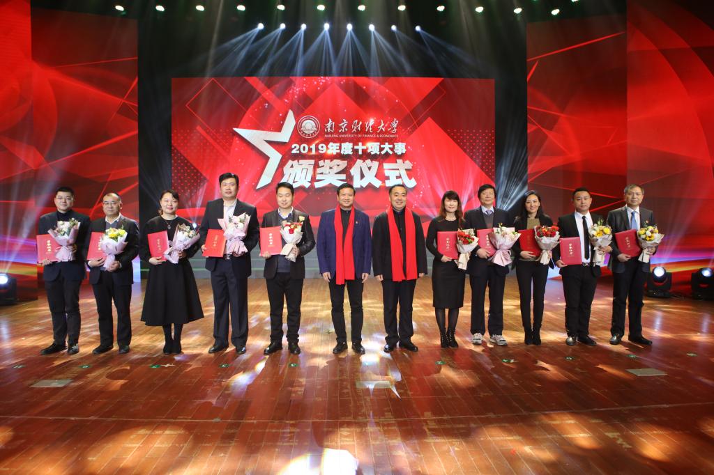 张利民书记、程永波校长为我校2019年度“十项大事”获评单位代表颁奖。根据《关于开展2019年度南京财经大学“十项大事 ”评选工作的实施方案》,在综合全校各单位推荐候选建议的基础上,由评选小组按照实施方案的评选条件推选出候选方案,经校长专题会研究讨论,形成我校2019年度“十项大事”推荐名单,即:扎实开展“不忘初心、牢记使命”主题教育、人才培养亮点突出、专业与课程建设特色彰显、学科建设取得重大突破、科学研究成绩喜人、师资队伍建设取得重大进展、对外合作交流开创新局面、校企合作成果丰硕、学校治理体系不断完善、民生工程和办学条件不断优化。