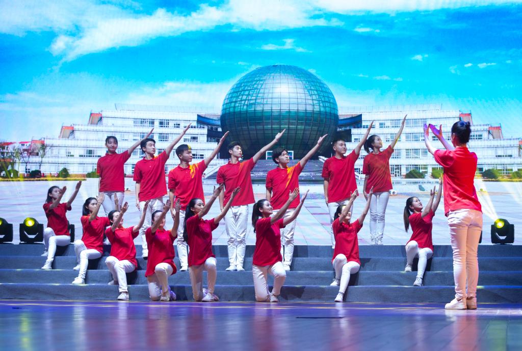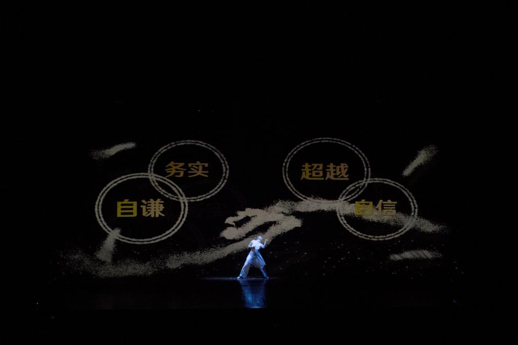 晚会开始前,高科技全息视频展示了我校2019年度取得的辉煌成绩。立体生动的视觉效果使观众拥有全新感受,伴着音乐展现的画面仿佛伸手可触,蓝色的光芒在舞者手中流动,绘成我校所有努力的足迹,绘出我校所有奋斗者的理想。