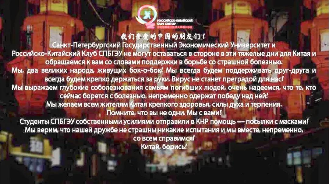 圣彼得堡国立财经大学中俄协会此刻的支持体现了两校之间牢不可破的友谊和互信,诠释了命运共同体的核心要义。相信在党和国家的坚强领导下,在最令人尊敬的医护人员的努力奋战下和全国人民的通力协作下,我们一定能够战胜病魔。