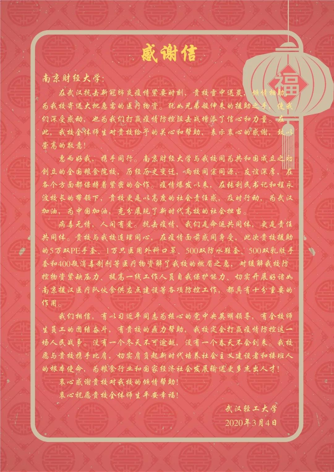众志成城抗疫情,勠力同心克时艰。3月4日,武汉轻工大学致信我校,感谢我校在抗击新冠肺炎疫情关键时期的倾情相助,并表示这充分体现了新时代高校的社会责任与担当。