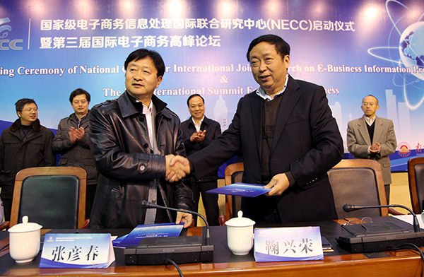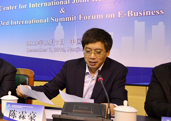 陈章龙书记致辞。他代表学校对科技部、商务部、江苏省科技厅、商务厅及南京市科委对我校NECC的大力支持表示谢意,并指出,NECC的成立将为我校展开更全面深入的合作研究提供了良好的平台,促进电子商务学科的更好发展,加深我校国际化合作交流程度。