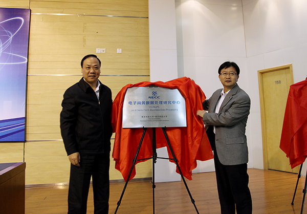 教授为“电子商务数据处理研究中心”和“电子商务三维可视化研究中心”揭牌,鞠兴荣副校长与